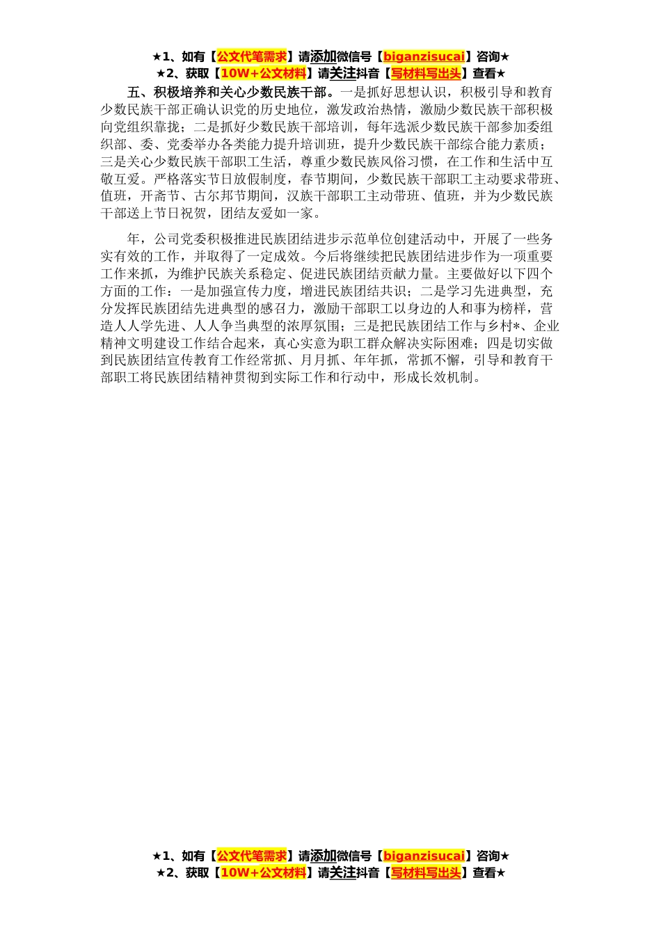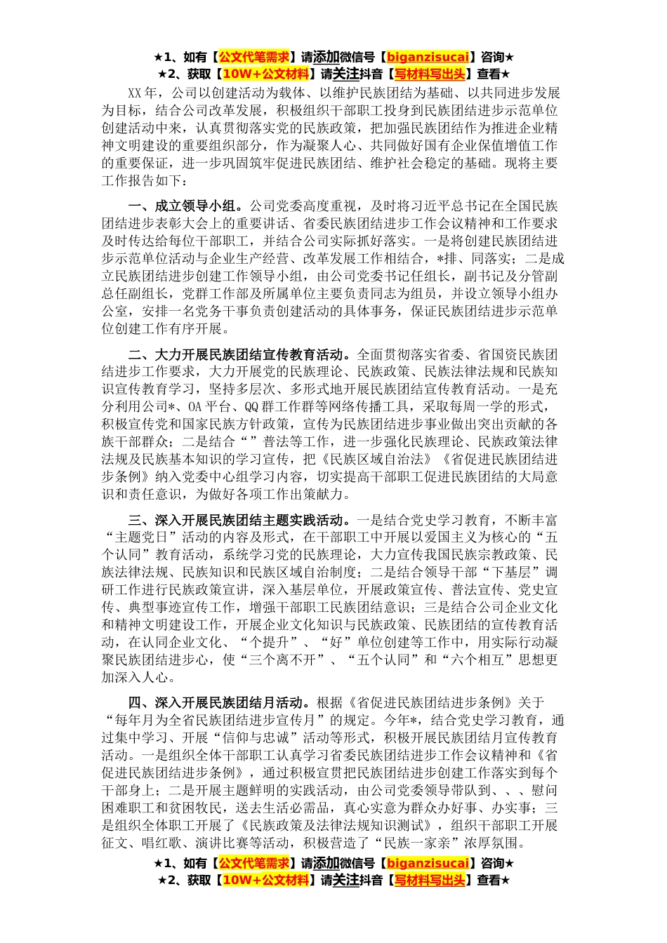 ★1、如有【公文代笔需求】请添加微信号【biganzisucai】咨询★★2、获取【10W+公文材料】请关注抖音【写材料写出头】查看★XX年,公司以创建活动为载体、以维护民族团结为基础、以共同进步发展为目标,结合公司改革发展,积极组织干部职工投身到民族团结进步示范单位创建活动中来,认真贯彻落实党的民族政策,把加强民族团结作为推进企业精神文明建设的重要组织部分,作为凝聚人心、共同做好国有企业保值增值工作的重要保证,进一步巩固筑牢促进民族团结、维护社会稳定的基础。现将主要工作报告如下:一、成立领导小组。公司党委高度重视,及时将习近平总书记在全国民族团结进步表彰大会上的重要讲话、省委民族团结进步工作会议精神和工作要求及时传达给每位干部职工,并结合公司实际抓好落实。一是将创建民族团...