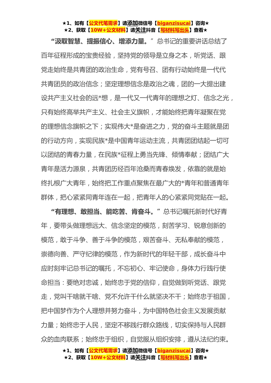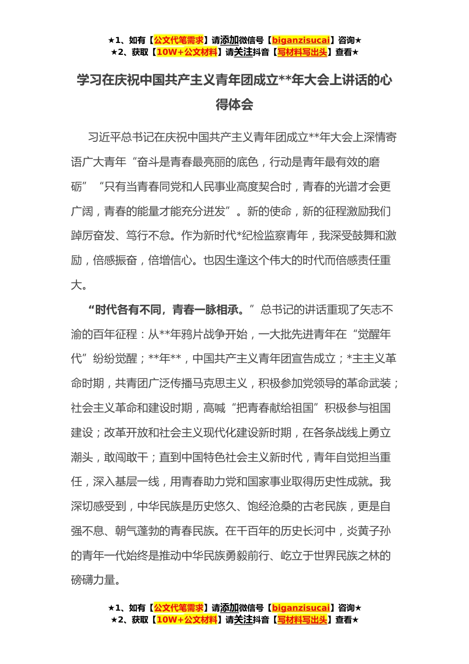 ★1、如有【公文代笔需求】请添加微信号【biganzisucai】咨询★★2、获取【10W+公文材料】请关注抖音【写材料写出头】查看★学习在庆祝中国共产主义青年团成立**年大会上讲话的心得体会习近平总书记在庆祝中国共产主义青年团成立**年大会上深情寄语广大青年“奋斗是青春最亮丽的底色,行动是青年最有效的磨砺”“只有当青春同党和人民事业高度契合时,青春的光谱才会更广阔,青春的能量才能充分迸发”。新的使命,新的征程激励我们踔厉奋发、笃行不怠。作为新时代*纪检监察青年,我深受鼓舞和激励,倍感振奋,倍增信心。也因生逢这个伟大的时代而倍感责任重大。“时代各有不同,青春一脉相承。”总书记的讲话重现了矢志不渝的百年征程:从**年鸦片战争开始,一大批先进青年在“觉醒年代”纷纷觉醒;**年**,中国共...