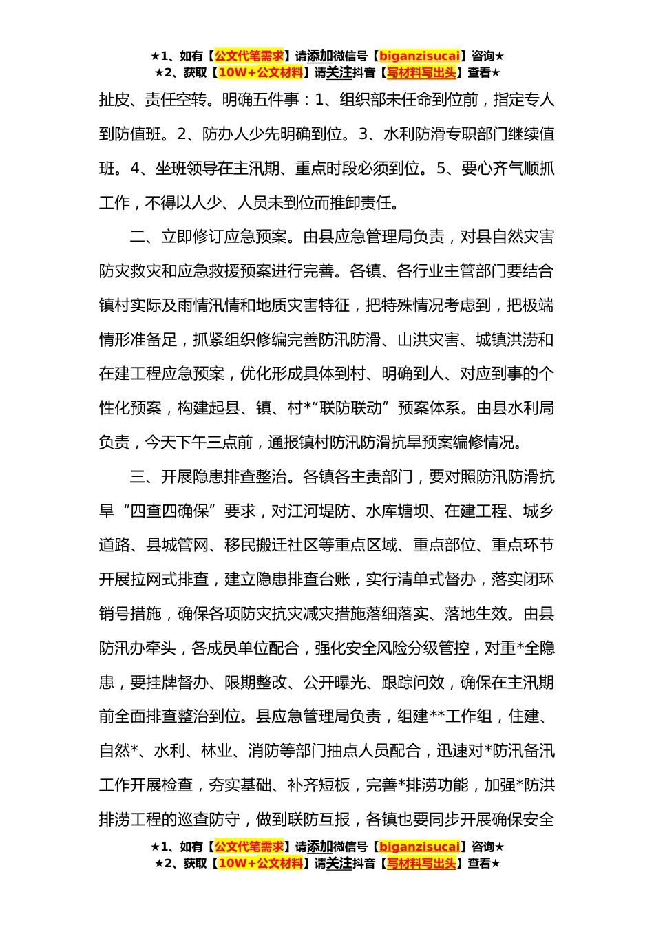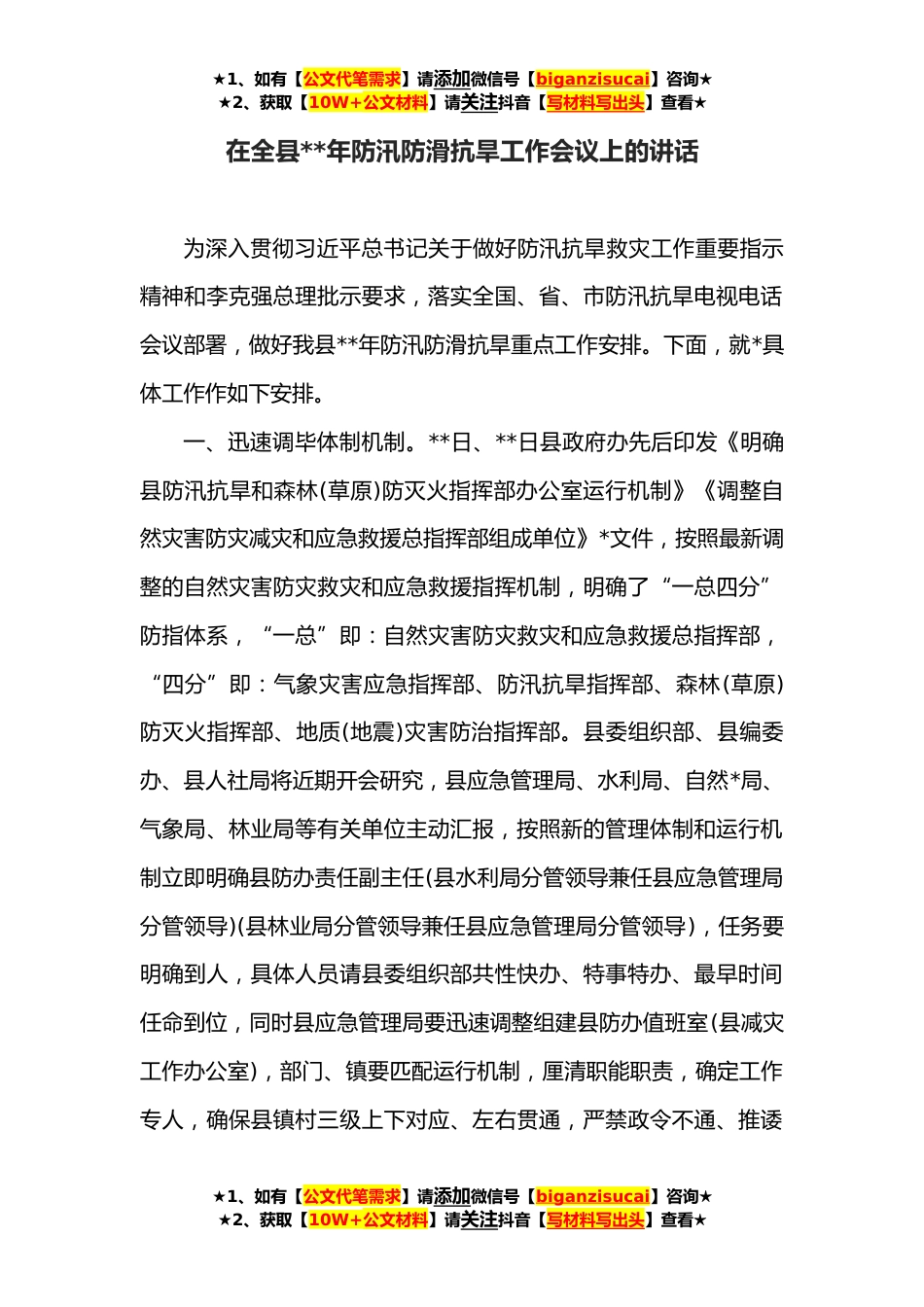 ★1、如有【公文代笔需求】请添加微信号【biganzisucai】咨询★★2、获取【10W+公文材料】请关注抖音【写材料写出头】查看★在全县**年防汛防滑抗旱工作会议上的讲话为深入贯彻习近平总书记关于做好防汛抗旱救灾工作重要指示精神和李克强总理批示要求,落实全国、省、市防汛抗旱电视电话会议部署,做好我县**年防汛防滑抗旱重点工作安排。下面,就*具体工作作如下安排。一、迅速调毕体制机制。**日、**日县政府办先后印发《明确县防汛抗旱和森林(草原)防灭火指挥部办公室运行机制》《调整自然灾害防灾减灾和应急救援总指挥部组成单位》*文件,按照最新调整的自然灾害防灾救灾和应急救援指挥机制,明确了“一总四分”防指体系,“一总”即:自然灾害防灾救灾和应急救援总指挥部,“四分”即:气象灾害应急指挥部、...