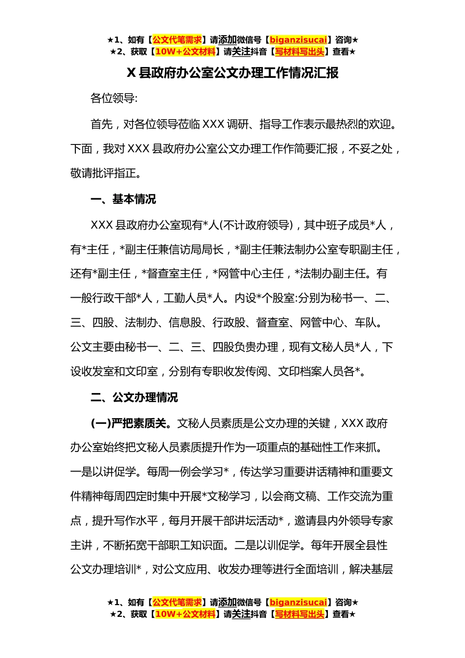 ★1、如有【公文代笔需求】请添加微信号【biganzisucai】咨询★★2、获取【10W+公文材料】请关注抖音【写材料写出头】查看★X县政府办公室公文办理工作情况汇报各位领导:首先,对各位领导莅临XXX调研、指导工作表示最热烈的欢迎。下面,我对XXX县政府办公室公文办理工作作简要汇报,不妥之处,敬请批评指正。一、基本情况XXX县政府办公室现有*人(不计政府领导),其中班子成员*人,有*主任,*副主任兼信访局局长,*副主任兼法制办公室专职副主任,还有*副主任,*督查室主任,*网管中心主任,*法制办副主任。有一般行政干部*人,工勤人员*人。内设*个股室:分别为秘书一、二、三、四股、法制办、信息股、行政股、督查室、网管中心、车队。公文主要由秘书一、二、三、四股负贵办理,现有文秘人员*人,下设收发室和文印...