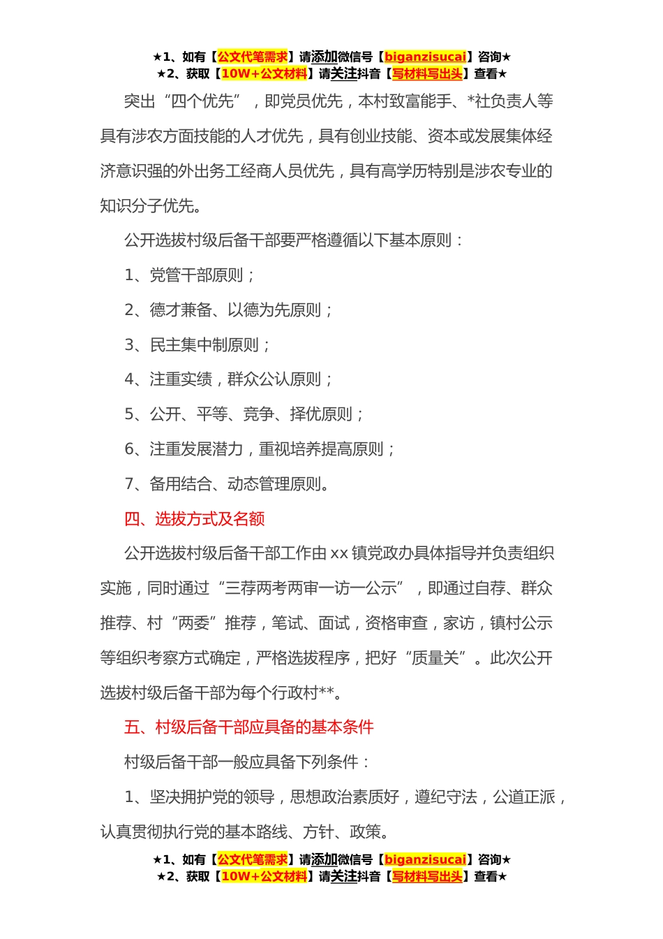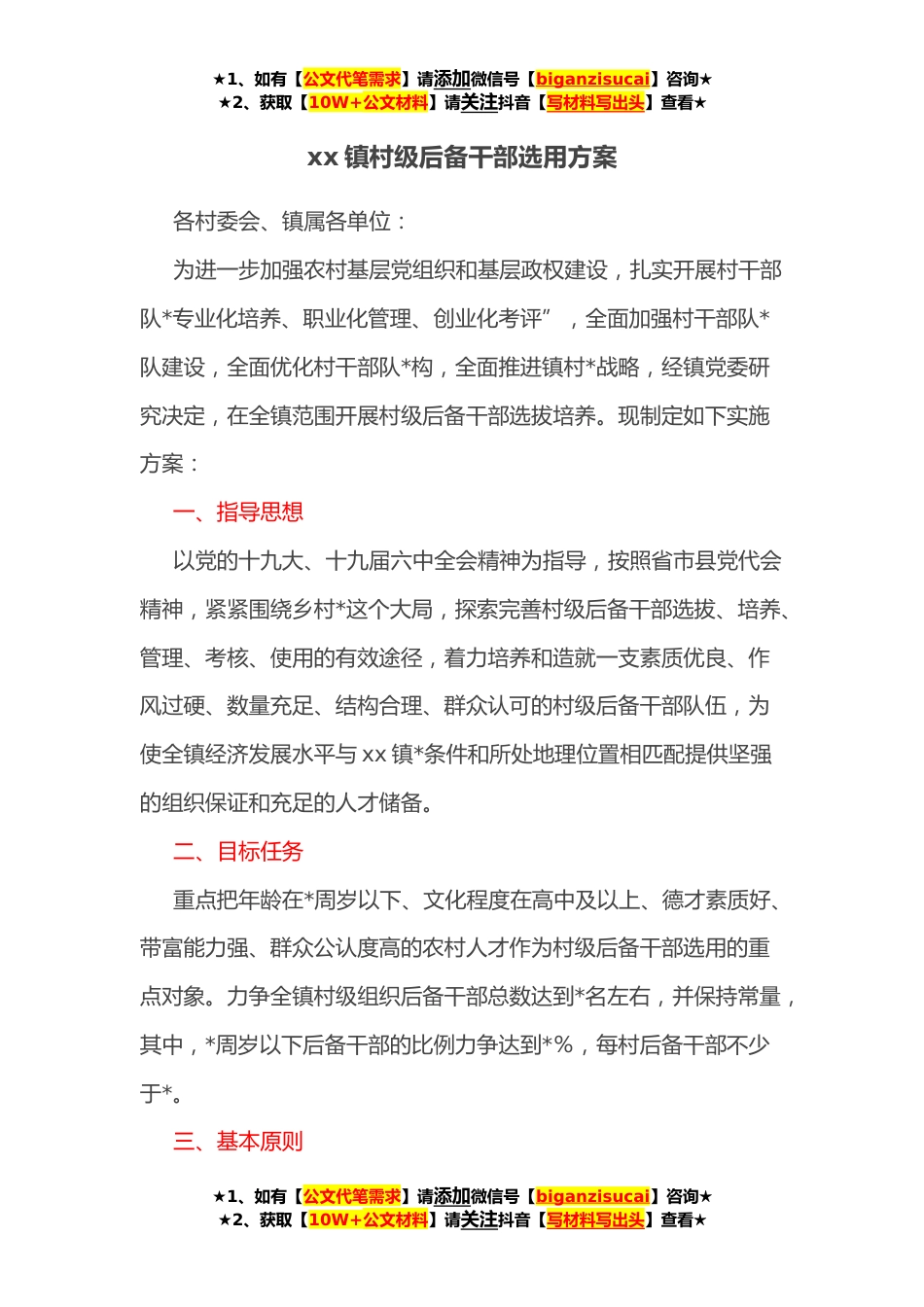 ★1、如有【公文代笔需求】请添加微信号【biganzisucai】咨询★★2、获取【10W+公文材料】请关注抖音【写材料写出头】查看★xx镇村级后备干部选用方案各村委会、镇属各单位:为进一步加强农村基层党组织和基层政权建设,扎实开展村干部队*专业化培养、职业化管理、创业化考评”,全面加强村干部队*队建设,全面优化村干部队*构,全面推进镇村*战略,经镇党委研究决定,在全镇范围开展村级后备干部选拔培养。现制定如下实施方案:一、指导思想以党的十九大、十九届六中全会精神为指导,按照省市县党代会精神,紧紧围绕乡村*这个大局,探索完善村级后备干部选拔、培养、管理、考核、使用的有效途径,着力培养和造就一支素质优良、作风过硬、数量充足、结构合理、群众认可的村级后备干部队伍,为使全镇经济发展水平与...