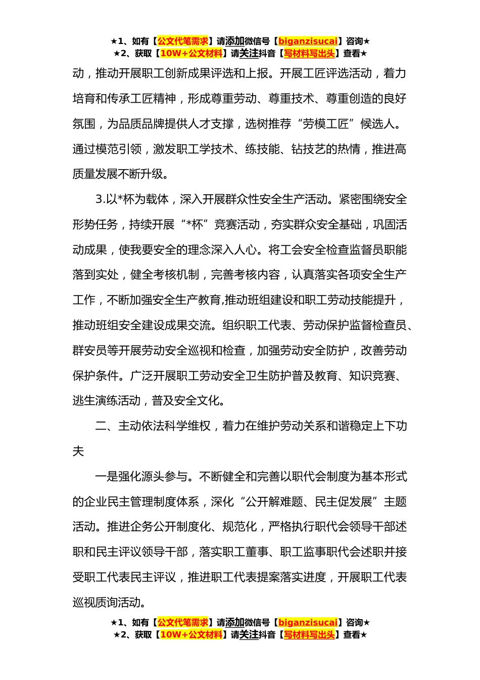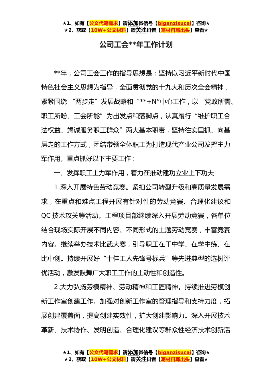 ★1、如有【公文代笔需求】请添加微信号【biganzisucai】咨询★★2、获取【10W+公文材料】请关注抖音【写材料写出头】查看★公司工会**年工作计划**年,公司工会工作的指导思想是:坚持以习近平新时代中国特色社会主义思想为指导,全面贯彻党的十九大和历次全会精神,紧紧围绕“两步走”发展战略和“**+N”中心工作,以“党政所需、职工所盼、工会所能”为出发点和落脚点,认真履行“维护职工合法权益、竭诚服务职工群众”两大基本职责,坚持往实里抓、向基层走的工作方式,团结带领全体职工为打造现代产业公司发挥主力军作用。重点抓好以下主要工作:一、发挥职工主力军作用,着力在推动建功立业上下功夫1.深入开展特色劳动竞赛。紧扣公司转型升级和高质量发展需求,在重点和难点工程开展有针对性的劳动竞赛、合...