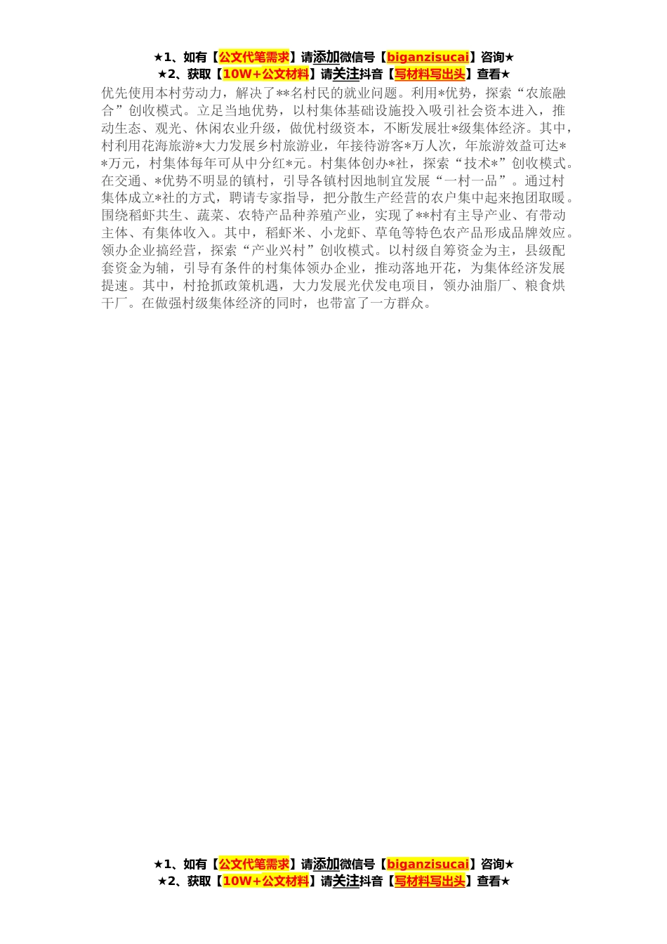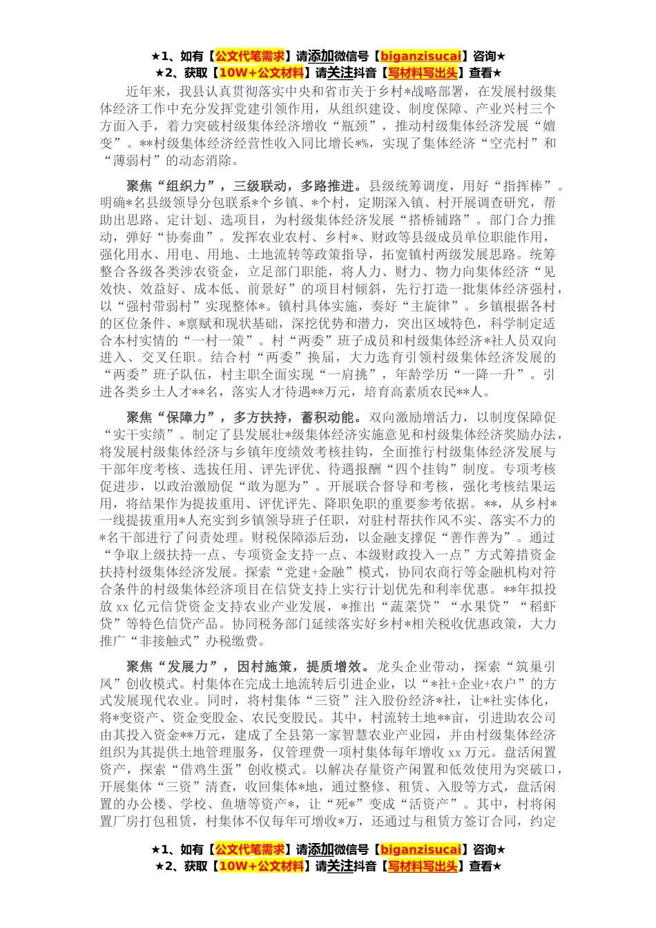 ★1、如有【公文代笔需求】请添加微信号【biganzisucai】咨询★★2、获取【10W+公文材料】请关注抖音【写材料写出头】查看★近年来,我县认真贯彻落实中央和省市关于乡村*战略部署,在发展村级集体经济工作中充分发挥党建引领作用,从组织建设、制度保障、产业兴村三个方面入手,着力突破村级集体经济增收“瓶颈”,推动村级集体经济发展“嬗变”。**村级集体经济经营性收入同比增长*%,实现了集体经济“空壳村”和“薄弱村”的动态消除。聚焦“组织力”,三级联动,多路推进。县级统筹调度,用好“指挥棒”。明确*名县级领导分包联系*个乡镇、*个村,定期深入镇、村开展调查研究,帮助出思路、定计划、选项目,为村级集体经济发展“搭桥铺路”。部门合力推动,弹好“协奏曲”。发挥农业农村、乡村*、财政等县级成...