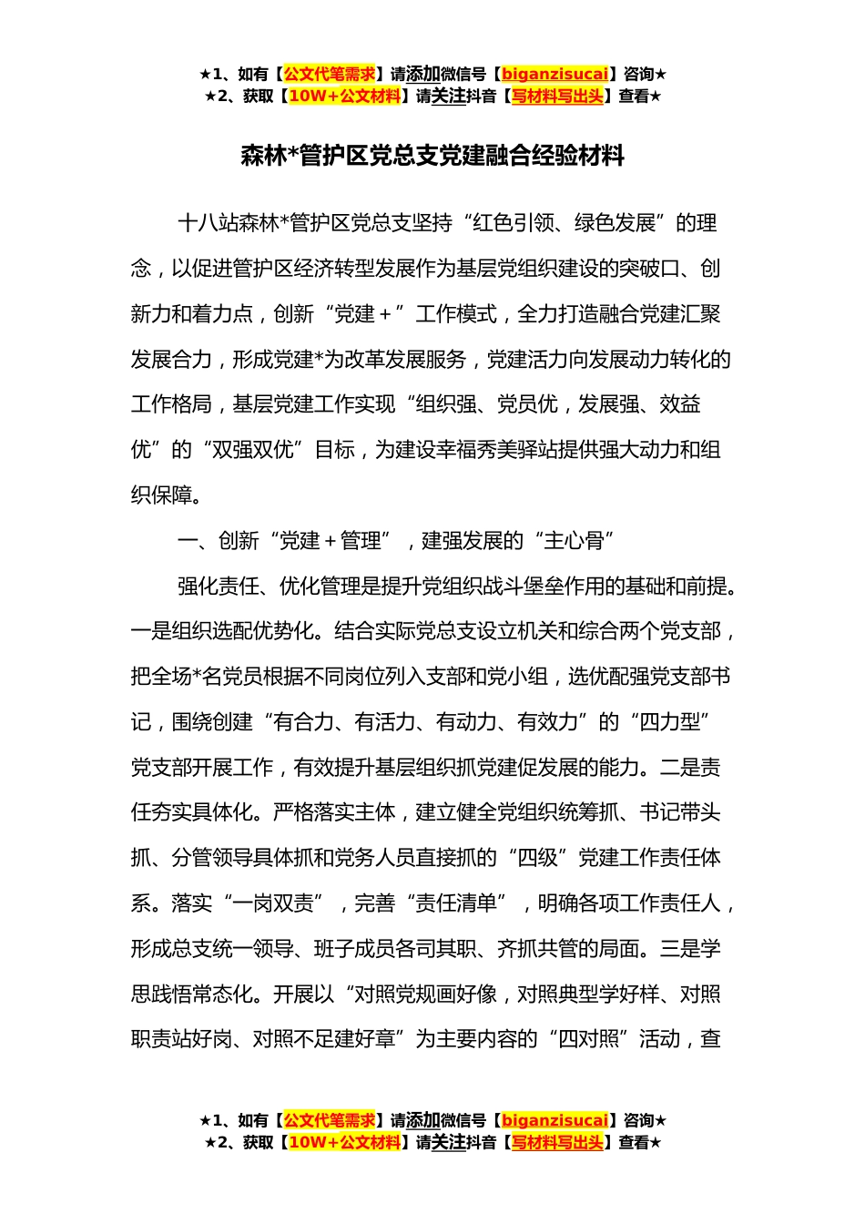 ★1、如有【公文代笔需求】请添加微信号【biganzisucai】咨询★★2、获取【10W+公文材料】请关注抖音【写材料写出头】查看★森林*管护区党总支党建融合经验材料十八站森林*管护区党总支坚持“红色引领、绿色发展”的理念,以促进管护区经济转型发展作为基层党组织建设的突破口、创新力和着力点,创新“党建+”工作模式,全力打造融合党建汇聚发展合力,形成党建*为改革发展服务,党建活力向发展动力转化的工作格局,基层党建工作实现“组织强、党员优,发展强、效益优”的“双强双优”目标,为建设幸福秀美驿站提供强大动力和组织保障。一、创新“党建+管理”,建强发展的“主心骨”强化责任、优化管理是提升党组织战斗堡垒作用的基础和前提。一是组织选配优势化。结合实际党总支设立机关和综合两个党支部,把全...