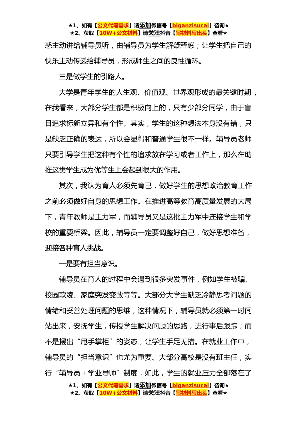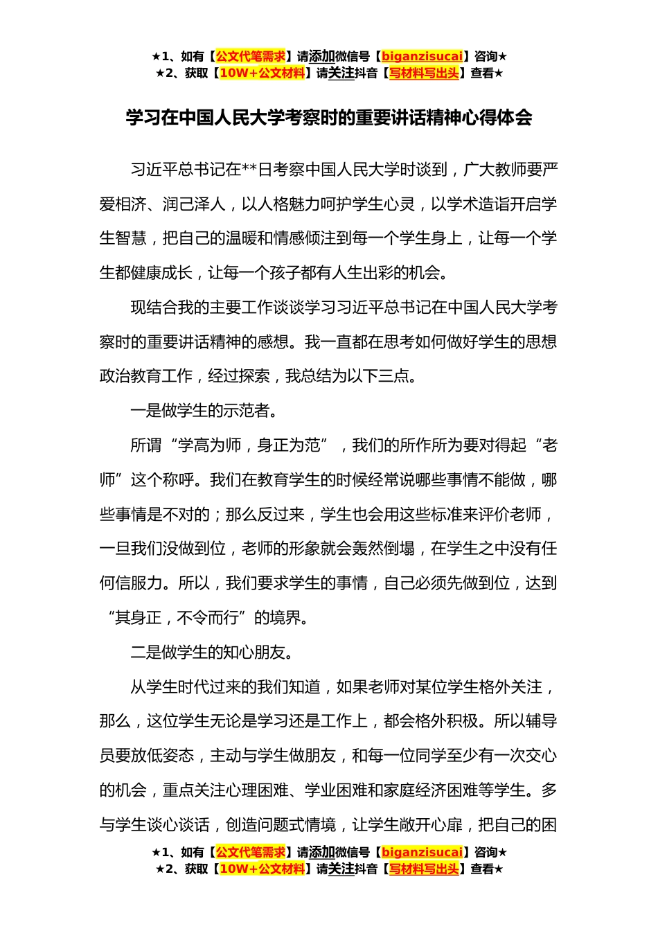★1、如有【公文代笔需求】请添加微信号【biganzisucai】咨询★★2、获取【10W+公文材料】请关注抖音【写材料写出头】查看★学习在中国人民大学考察时的重要讲话精神心得体会习近平总书记在**日考察中国人民大学时谈到,广大教师要严爱相济、润己泽人,以人格魅力呵护学生心灵,以学术造诣开启学生智慧,把自己的温暖和情感倾注到每一个学生身上,让每一个学生都健康成长,让每一个孩子都有人生出彩的机会。现结合我的主要工作谈谈学习习近平总书记在中国人民大学考察时的重要讲话精神的感想。我一直都在思考如何做好学生的思想政治教育工作,经过探索,我总结为以下三点。一是做学生的示范者。所谓“学高为师,身正为范”,我们的所作所为要对得起“老师”这个称呼。我们在教育学生的时候经常说哪些事情不能做,...