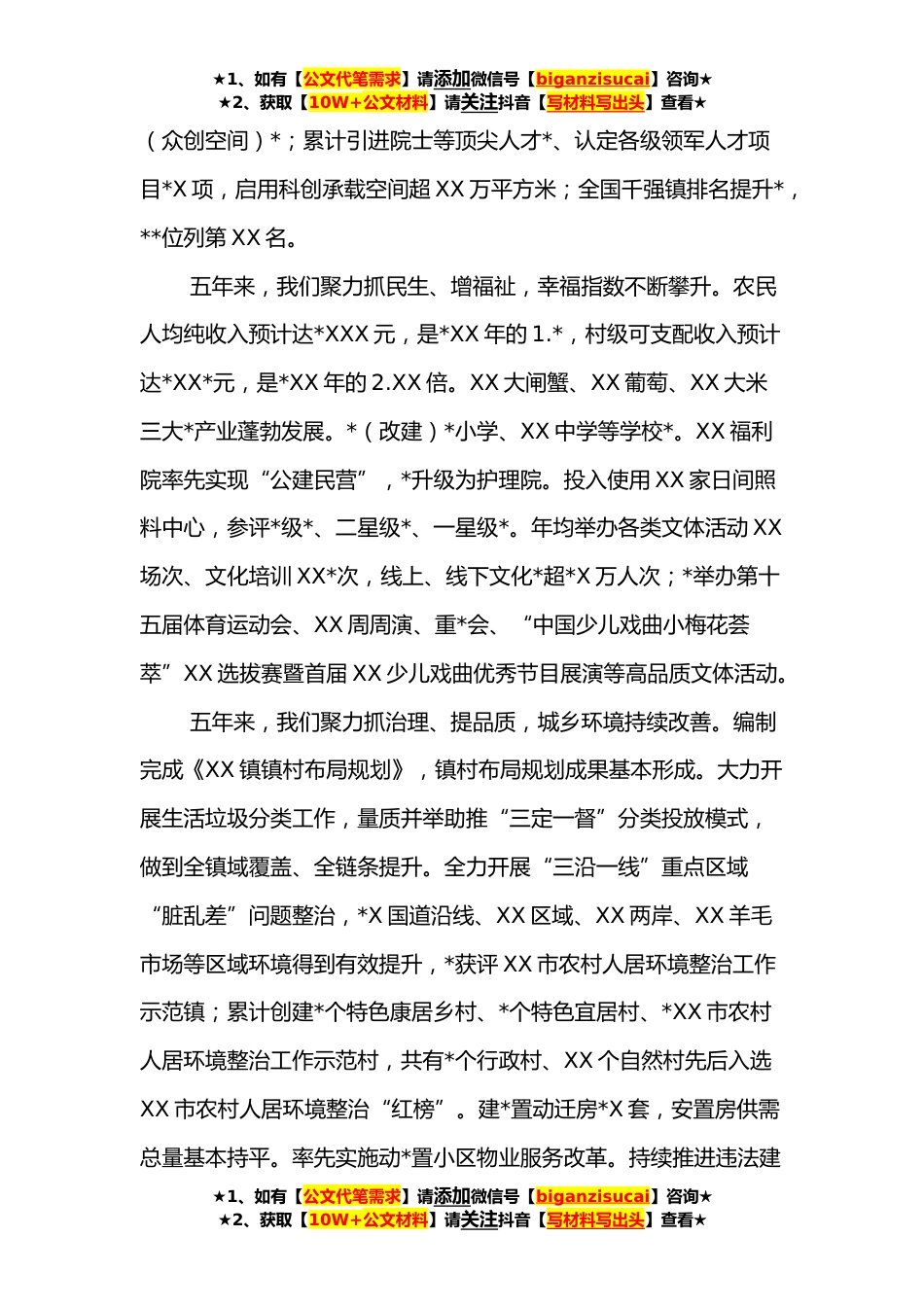 ★1、如有【公文代笔需求】请添加微信号【biganzisucai】咨询★★2、获取【10W+公文材料】请关注抖音【写材料写出头】查看★镇政府工作报告(五年)现在,我代表XX镇人民政府,向大会报告工作,请予审议,并请各位列席人员提出意见。过去五年和**工作回顾刚刚过去的五年,是风险与挑战叠加、危机与机遇并存的五年,是在统筹抓好疫情防控的同时,取得经济社会发展显著成就的五年。五年来,我们坚持以习近平新时代中国特色社会主义思想为指导,在市委、市政府和镇党委的坚强领导下,经济实力稳步攀升、创新步伐不断加速、城镇品质持续优化、民生福祉再上台阶、社会治理开创新局、政府服务高效务实,为“十四五”开好局、起好步,全面建设社会主义现代化奠定了坚实基础。五年来,我们聚力抓经济、促发展,综合实力显...