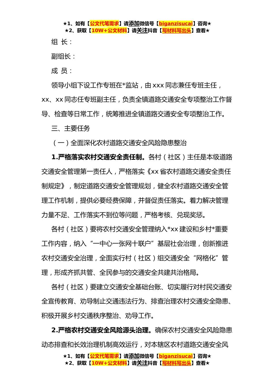 ★1、如有【公文代笔需求】请添加微信号【biganzisucai】咨询★★2、获取【10W+公文材料】请关注抖音【写材料写出头】查看★xxx镇**年全面深化道路交通安全专项整治工作方案为深入贯彻落实习近平总书记关于安全生产重要论述和视察xx重要讲话精神以及省委省政府、市委市政府关于安全生产和道路交通安全各项决策部署,持续巩固道路交通安全专项整治成果,全力防范化解道路交通领域安全风险隐患,根据《xx省全面深化道路交通安全专项整治工作方案》、《**年xx省道路交通事故预防“减量控大”工作方案》、《xx市**年全面深化道路交通安全专项整治工作方案》和《xx县**年全面深化道路交通安全专项整治工作方案》,特制定本方案。一、工作目标坚持人民至上、生命至上,围绕“人、车、路、企、政”五个方面,压实交通安全...