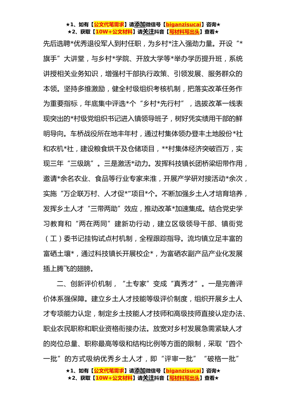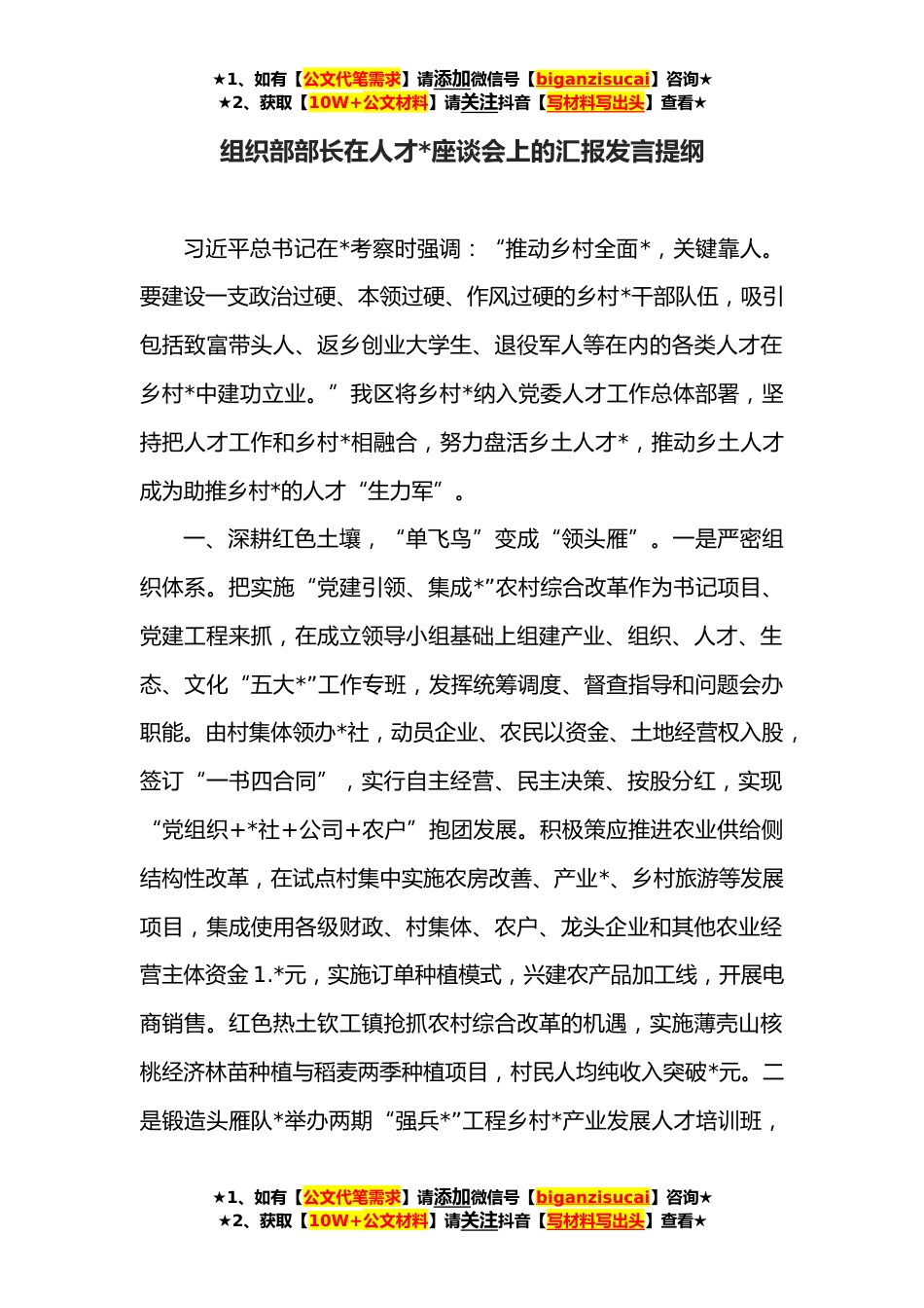 ★1、如有【公文代笔需求】请添加微信号【biganzisucai】咨询★★2、获取【10W+公文材料】请关注抖音【写材料写出头】查看★组织部部长在人才*座谈会上的汇报发言提纲习近平总书记在*考察时强调:“推动乡村全面*,关键靠人。要建设一支政治过硬、本领过硬、作风过硬的乡村*干部队伍,吸引包括致富带头人、返乡创业大学生、退役军人等在内的各类人才在乡村*中建功立业。”我区将乡村*纳入党委人才工作总体部署,坚持把人才工作和乡村*相融合,努力盘活乡土人才*,推动乡土人才成为助推乡村*的人才“生力军”。一、深耕红色土壤,“单飞鸟”变成“领头雁”。一是严密组织体系。把实施“党建引领、集成*”农村综合改革作为书记项目、党建工程来抓,在成立领导小组基础上组建产业、组织、人才、生态、文化“五大*”工...