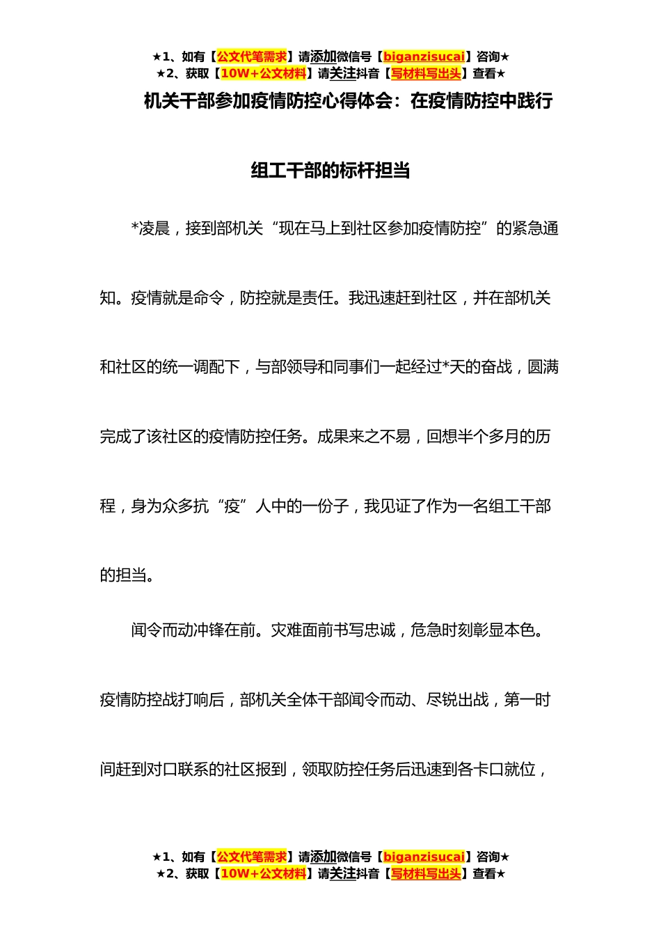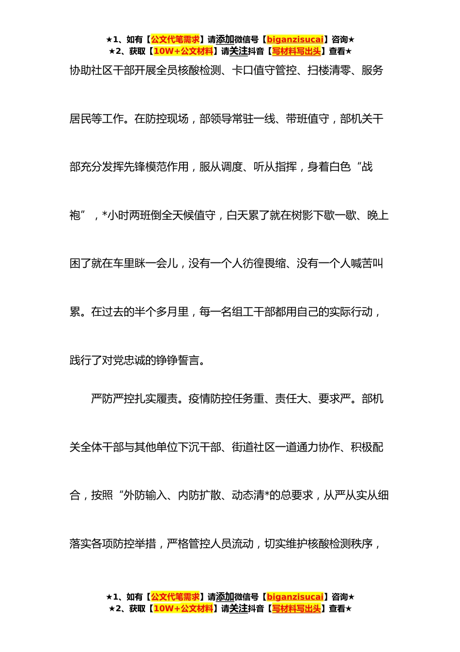 ★1、如有【公文代笔需求】请添加微信号【biganzisucai】咨询★★2、获取【10W+公文材料】请关注抖音【写材料写出头】查看★机关干部参加疫情防控心得体会:在疫情防控中践行组工干部的标杆担当*凌晨,接到部机关“现在马上到社区参加疫情防控”的紧急通知。疫情就是命令,防控就是责任。我迅速赶到社区,并在部机关和社区的统一调配下,与部领导和同事们一起经过*天的奋战,圆满完成了该社区的疫情防控任务。成果来之不易,回想半个多月的历程,身为众多抗“疫”人中的一份子,我见证了作为一名组工干部的担当。闻令而动冲锋在前。灾难面前书写忠诚,危急时刻彰显本色。疫情防控战打响后,部机关全体干部闻令而动、尽锐出战,第一时间赶到对口联系的社区报到,领取防控任务后迅速到各卡口就位,★1、如有【公文代...
