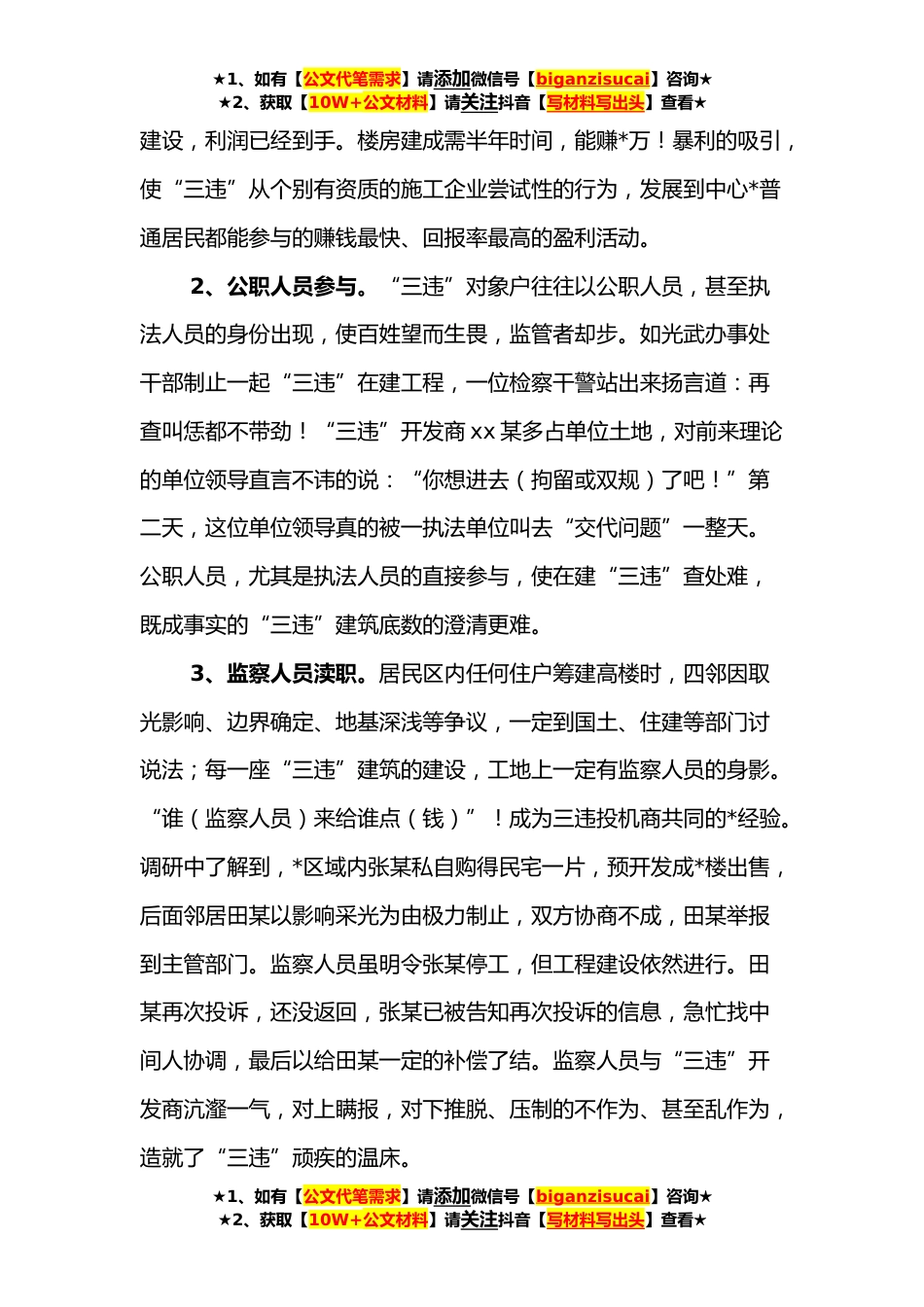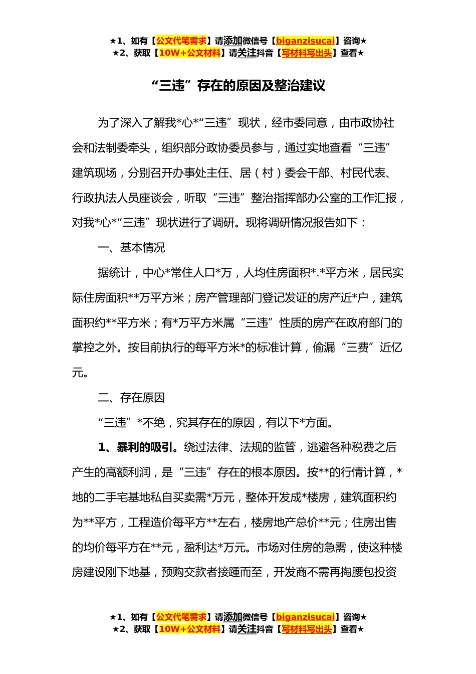 ★1、如有【公文代笔需求】请添加微信号【biganzisucai】咨询★★2、获取【10W+公文材料】请关注抖音【写材料写出头】查看★“三违”存在的原因及整治建议为了深入了解我*心*“三违”现状,经市委同意,由市政协社会和法制委牵头,组织部分政协委员参与,通过实地查看“三违”建筑现场,分别召开办事处主任、居(村)委会干部、村民代表、行政执法人员座谈会,听取“三违”整治指挥部办公室的工作汇报,对我*心*“三违”现状进行了调研。现将调研情况报告如下:一、基本情况据统计,中心*常住人口*万,人均住房面积*.*平方米,居民实际住房面积**万平方米;房产管理部门登记发证的房产近*户,建筑面积约**平方米;有*万平方米属“三违”性质的房产在政府部门的掌控之外。按目前执行的每平方米*的标准计算,偷漏“...