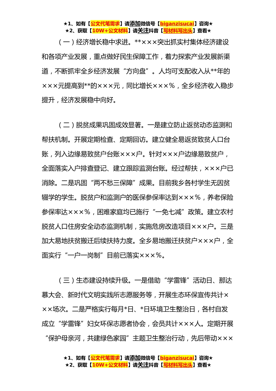 ★1、如有【公文代笔需求】请添加微信号【biganzisucai】咨询★★2、获取【10W+公文材料】请关注抖音【写材料写出头】查看★乡镇**政府工作报告各位代表:现在,我代表乡人民政府向大会报告工作,请予审议,并请各位政协委员和列席会议的同志提出意见。一、**工作回顾**是×××乡发展进程中具有里程碑意义的一年。面对百年变局的加速演进和世纪疫情的严峻形势,我们坚持以习近平新时代中国特色社会主义思想为指导,全面落实习近平总书记关于×××工作的重要讲话和指示批示精神,在州委、州政府*委、县政府的坚强领导下,从百年辉煌中砥砺初心使命,从百年经验中汲取智慧力量,以推动高质量发展为主题,以创造高品质生活为目标,统筹推进疫情防控和经济社会发展,在砥砺前行中铺开恢弘画卷,在不懈奋斗中成就绚美...