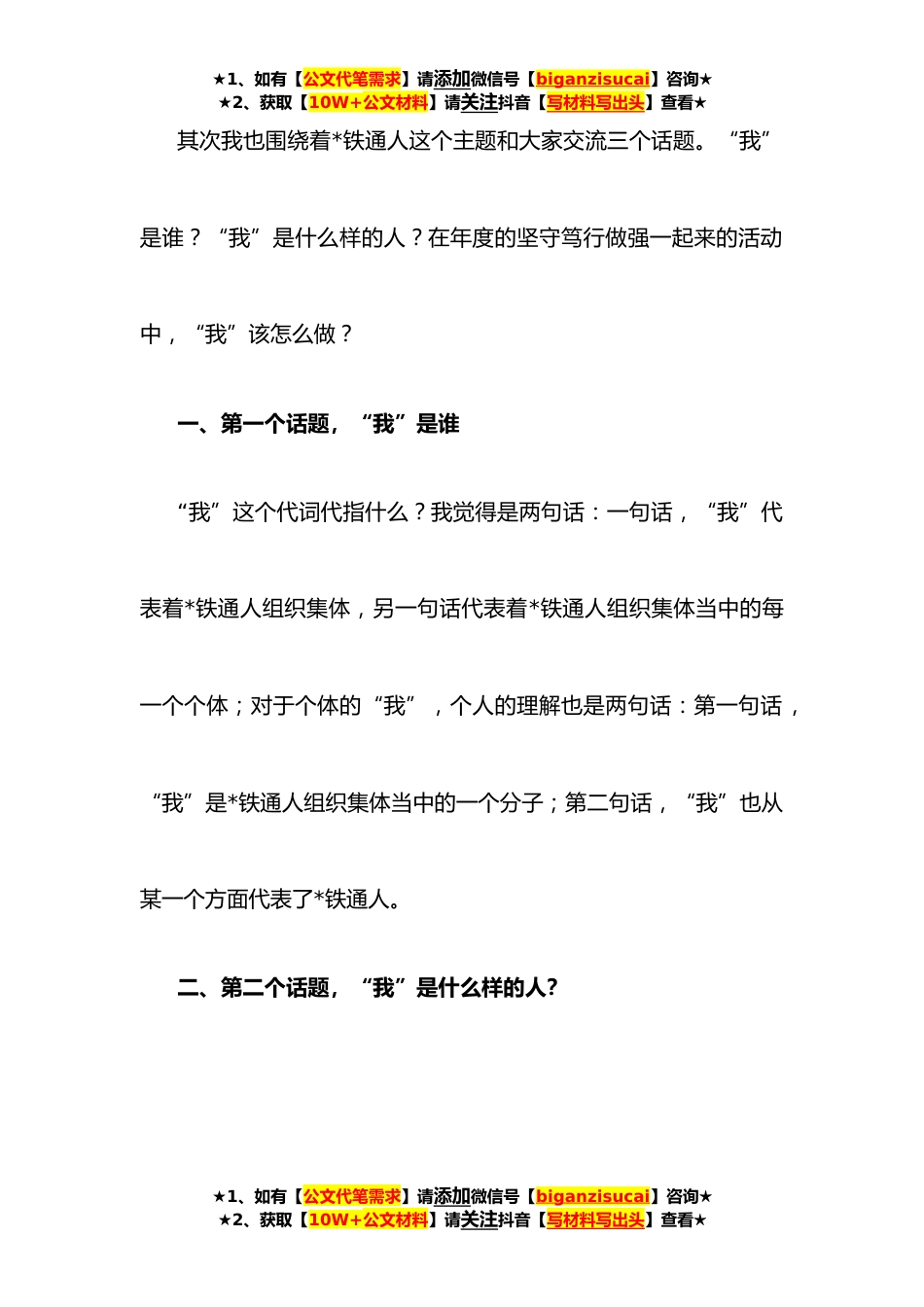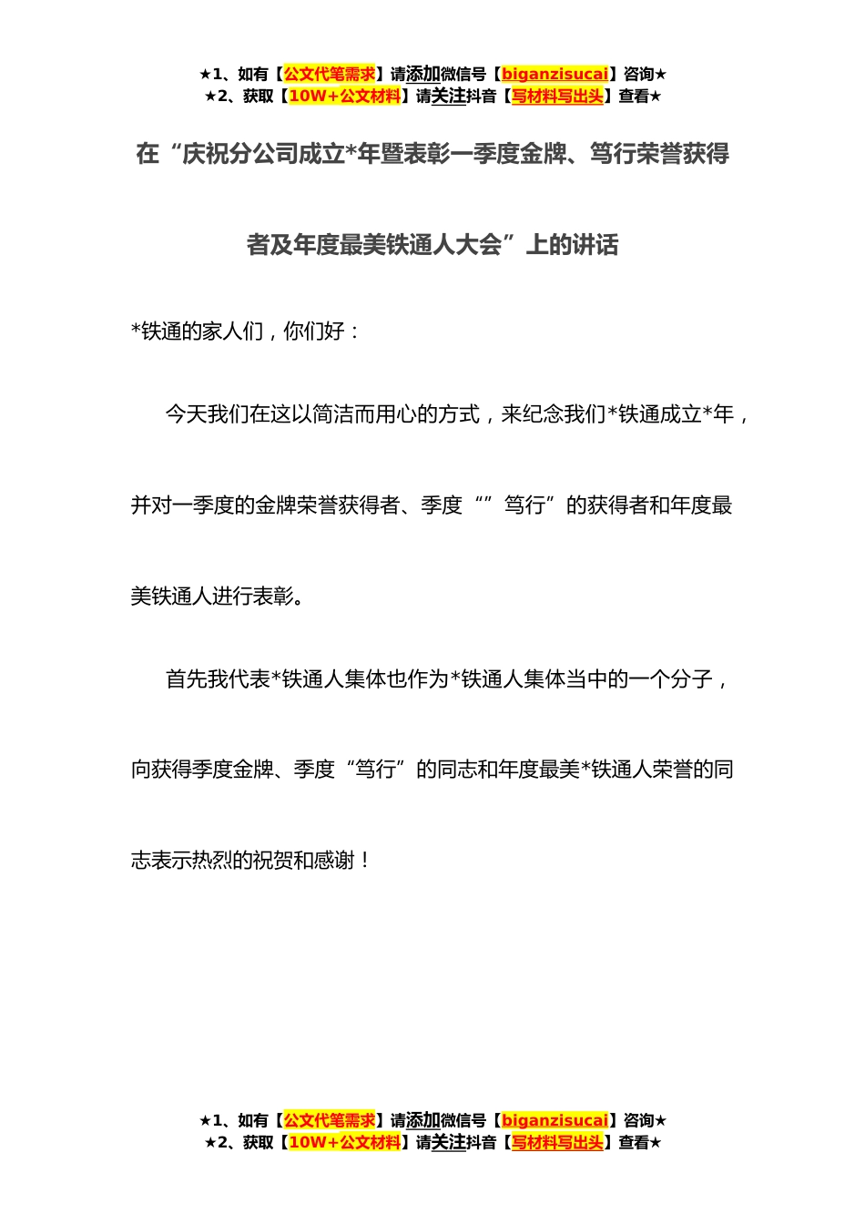 ★1、如有【公文代笔需求】请添加微信号【biganzisucai】咨询★★2、获取【10W+公文材料】请关注抖音【写材料写出头】查看★在“庆祝分公司成立*年暨表彰一季度金牌、笃行荣誉获得者及年度最美铁通人大会”上的讲话*铁通的家人们,你们好:今天我们在这以简洁而用心的方式,来纪念我们*铁通成立*年,并对一季度的金牌荣誉获得者、季度“”笃行”的获得者和年度最美铁通人进行表彰。首先我代表*铁通人集体也作为*铁通人集体当中的一个分子,向获得季度金牌、季度“笃行”的同志和年度最美*铁通人荣誉的同志表示热烈的祝贺和感谢!★1、如有【公文代笔需求】请添加微信号【biganzisucai】咨询★★2、获取【10W+公文材料】请关注抖音【写材料写出头】查看★★1、如有【公文代笔需求】请添加微信号【biganzisucai】咨...