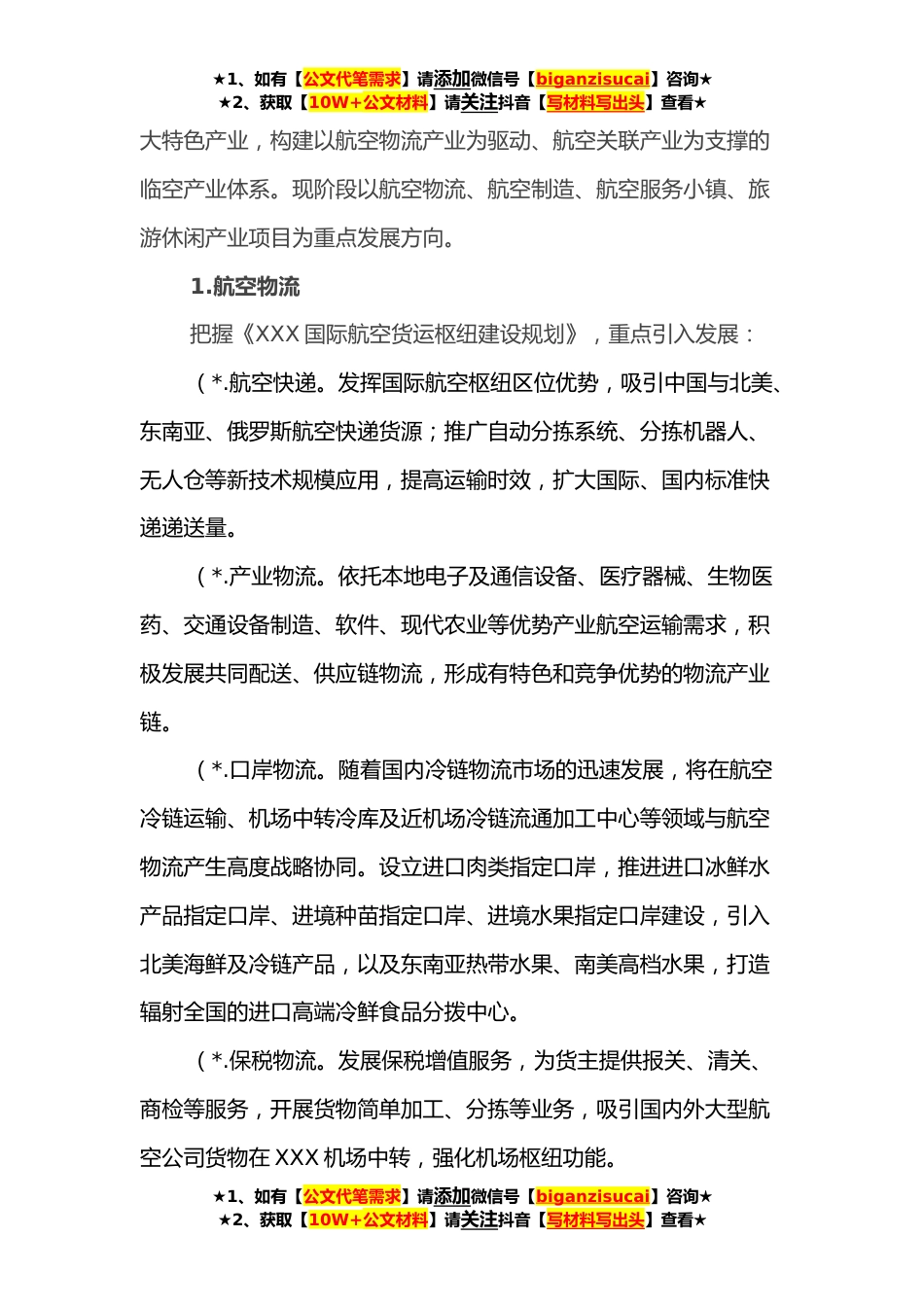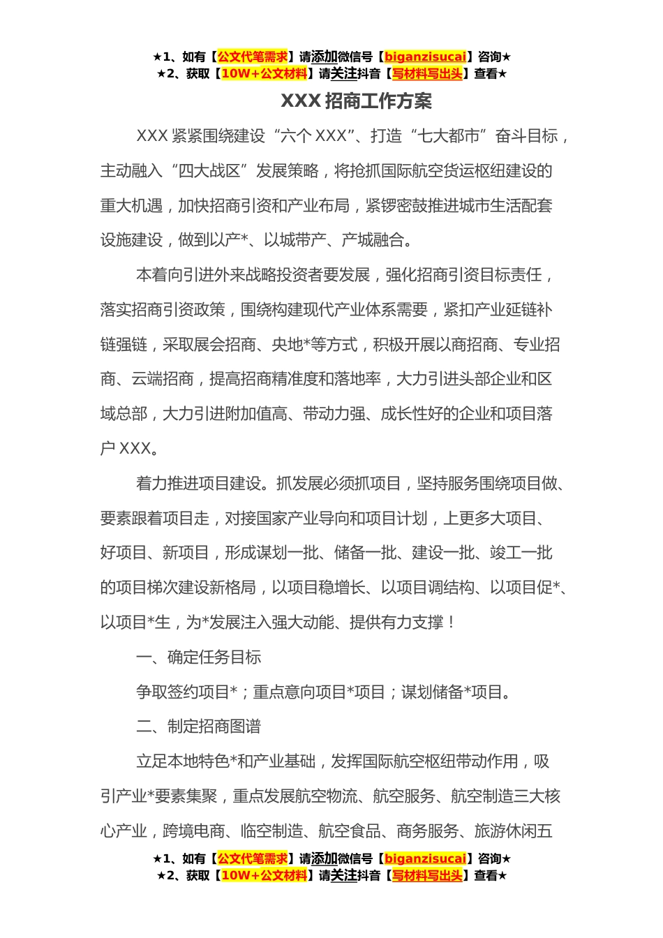 ★1、如有【公文代笔需求】请添加微信号【biganzisucai】咨询★★2、获取【10W+公文材料】请关注抖音【写材料写出头】查看★XXX招商工作方案XXX紧紧围绕建设“六个XXX”、打造“七大都市”奋斗目标,主动融入“四大战区”发展策略,将抢抓国际航空货运枢纽建设的重大机遇,加快招商引资和产业布局,紧锣密鼓推进城市生活配套设施建设,做到以产*、以城带产、产城融合。本着向引进外来战略投资者要发展,强化招商引资目标责任,落实招商引资政策,围绕构建现代产业体系需要,紧扣产业延链补链强链,采取展会招商、央地*等方式,积极开展以商招商、专业招商、云端招商,提高招商精准度和落地率,大力引进头部企业和区域总部,大力引进附加值高、带动力强、成长性好的企业和项目落户XXX。着力推进项目建设。抓发展必...