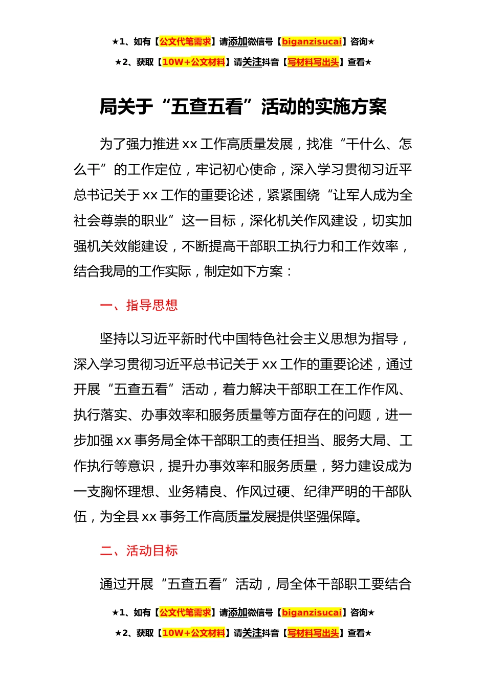 ★1、如有【公文代笔需求】请添加微信号【biganzisucai】咨询★★2、获取【10W+公文材料】请关注抖音【写材料写出头】查看★局关于“五查五看”活动的实施方案为了强力推进xx工作高质量发展,找准“干什么、怎么干”的工作定位,牢记初心使命,深入学习贯彻习近平总书记关于xx工作的重要论述,紧紧围绕“让军人成为全社会尊崇的职业”这一目标,深化机关作风建设,切实加强机关效能建设,不断提高干部职工执行力和工作效率,结合我局的工作实际,制定如下方案:一、指导思想坚持以习近平新时代中国特色社会主义思想为指导,深入学习贯彻习近平总书记关于xx工作的重要论述,通过开展“五查五看”活动,着力解决干部职工在工作作风、执行落实、办事效率和服务质量等方面存在的问题,进一步加强xx事务局全体干部职工...