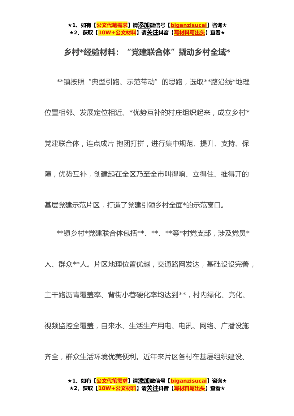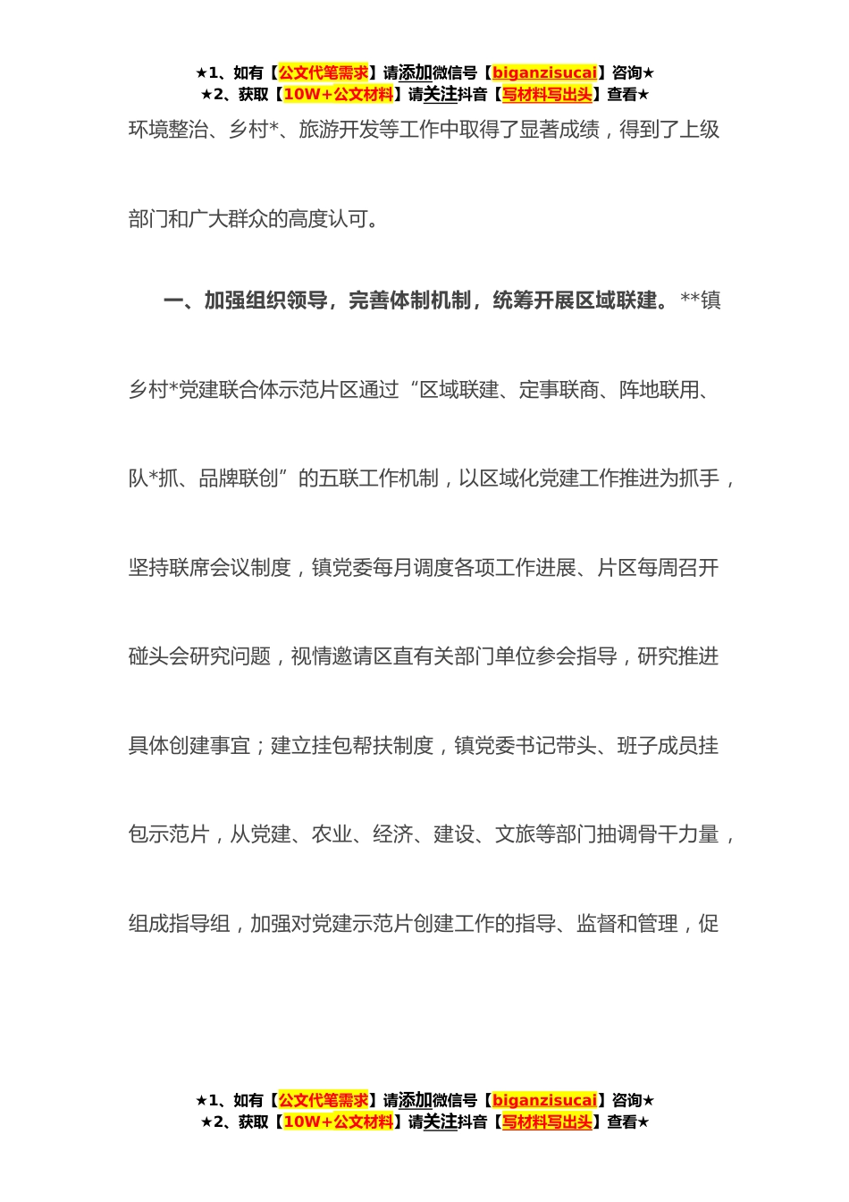 ★1、如有【公文代笔需求】请添加微信号【biganzisucai】咨询★★2、获取【10W+公文材料】请关注抖音【写材料写出头】查看★乡村*经验材料:“党建联合体”撬动乡村全域***镇按照“典型引路、示范带动”的思路,选取**路沿线*地理位置相邻、发展定位相近、*优势互补的村庄组织起来,成立乡村*党建联合体,连点成片抱团打拼,进行集中规范、提升、支持、保障,优势互补,创建起在全区乃至全市叫得响、立得住、推得开的基层党建示范片区,打造了党建引领乡村全面*的示范窗口。**镇乡村*党建联合体包括**、**、**等*村党支部,涉及党员*人、群众**人。片区地理位置优越,交通路网发达,基础设设完善,主干路沥青覆盖率、背街小巷硬化率均达到**,村内绿化、亮化、视频监控全覆盖,自来水、生活生产用电、电讯、网络、...
