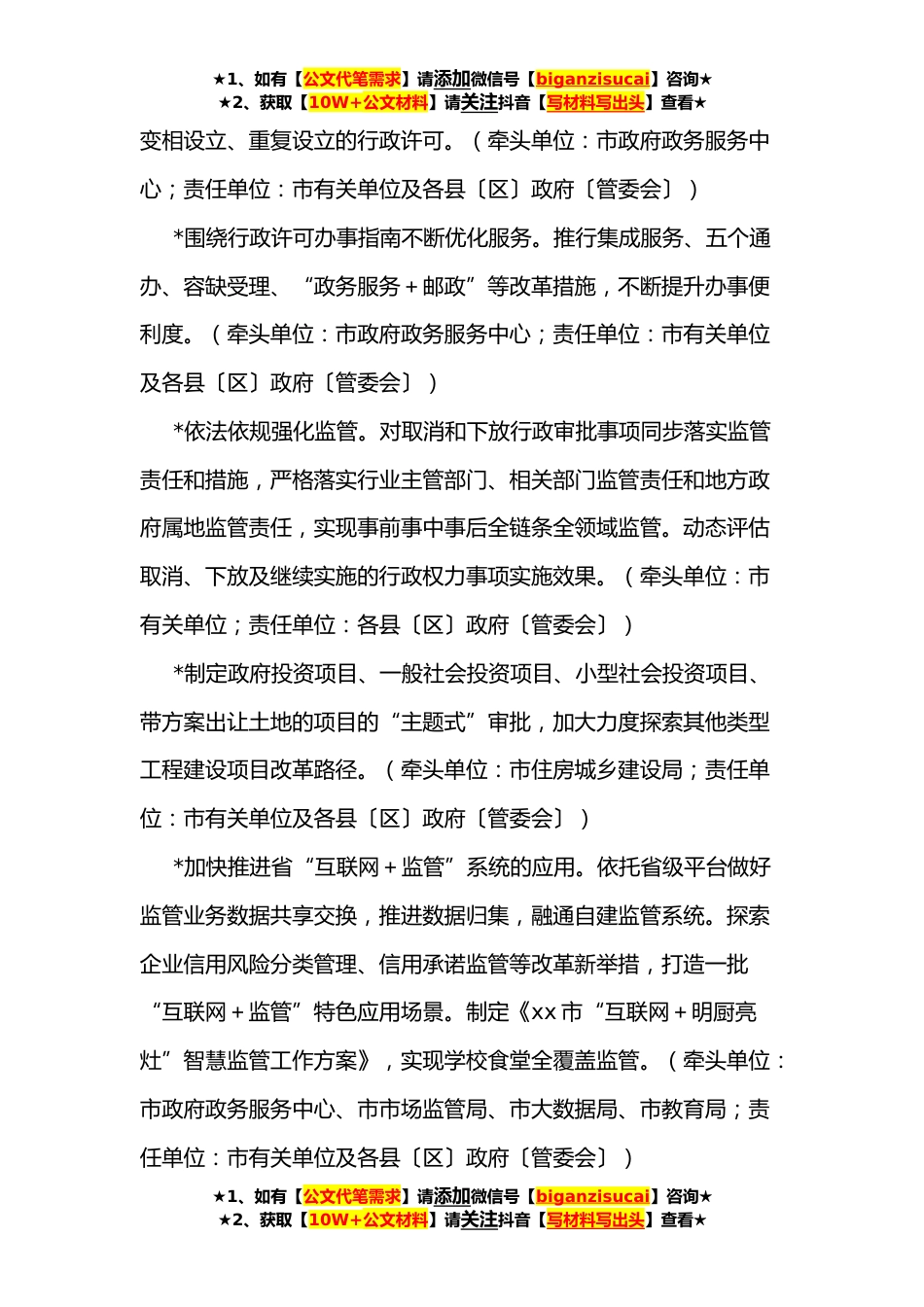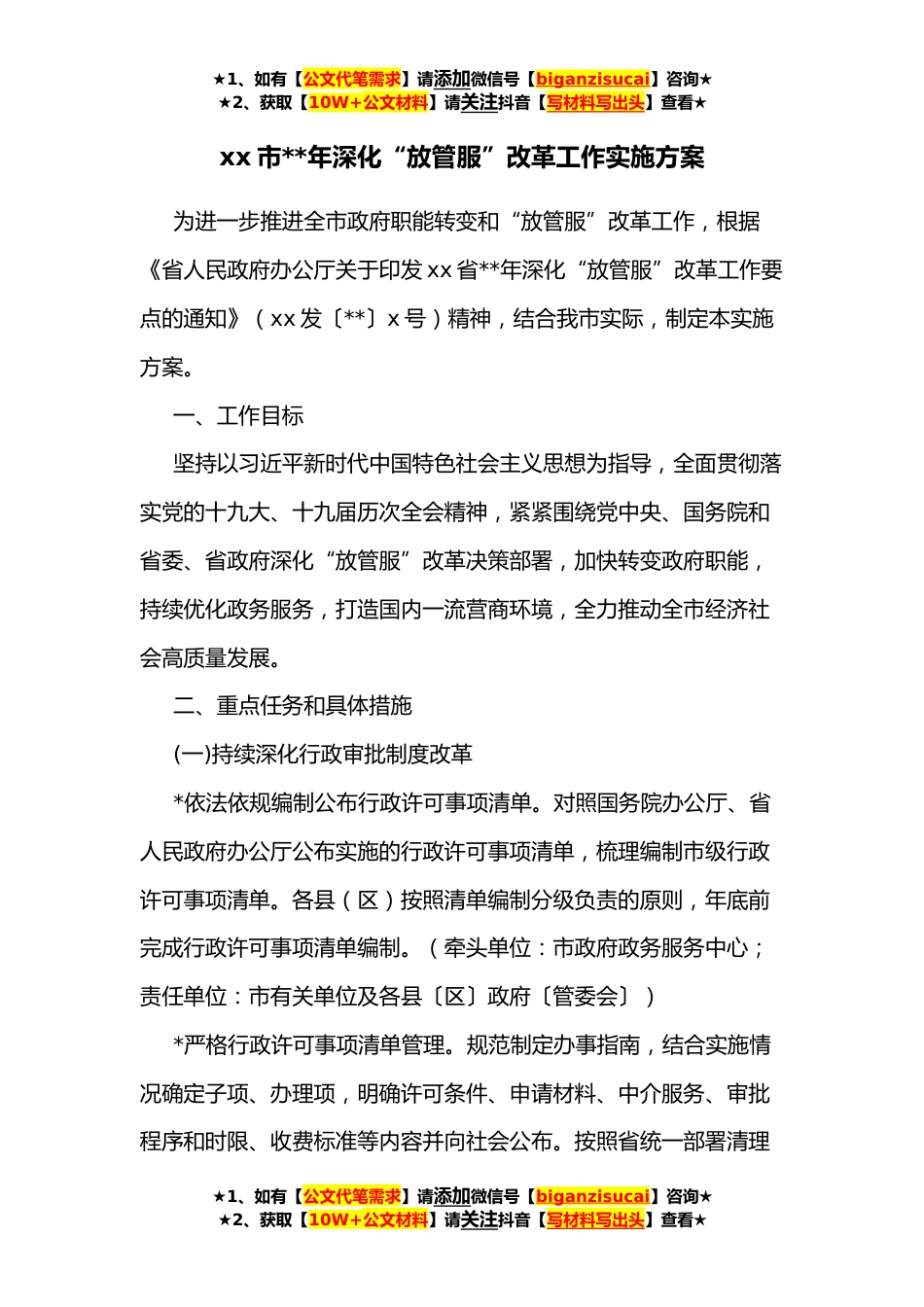 ★1、如有【公文代笔需求】请添加微信号【biganzisucai】咨询★★2、获取【10W+公文材料】请关注抖音【写材料写出头】查看★xx市**年深化“放管服”改革工作实施方案为进一步推进全市政府职能转变和“放管服”改革工作,根据《省人民政府办公厅关于印发xx省**年深化“放管服”改革工作要点的通知》(xx发〔**〕x号)精神,结合我市实际,制定本实施方案。一、工作目标坚持以习近平新时代中国特色社会主义思想为指导,全面贯彻落实党的十九大、十九届历次全会精神,紧紧围绕党中央、国务院和省委、省政府深化“放管服”改革决策部署,加快转变政府职能,持续优化政务服务,打造国内一流营商环境,全力推动全市经济社会高质量发展。二、重点任务和具体措施(一)持续深化行政审批制度改革*依法依规编制公布行政许可事...