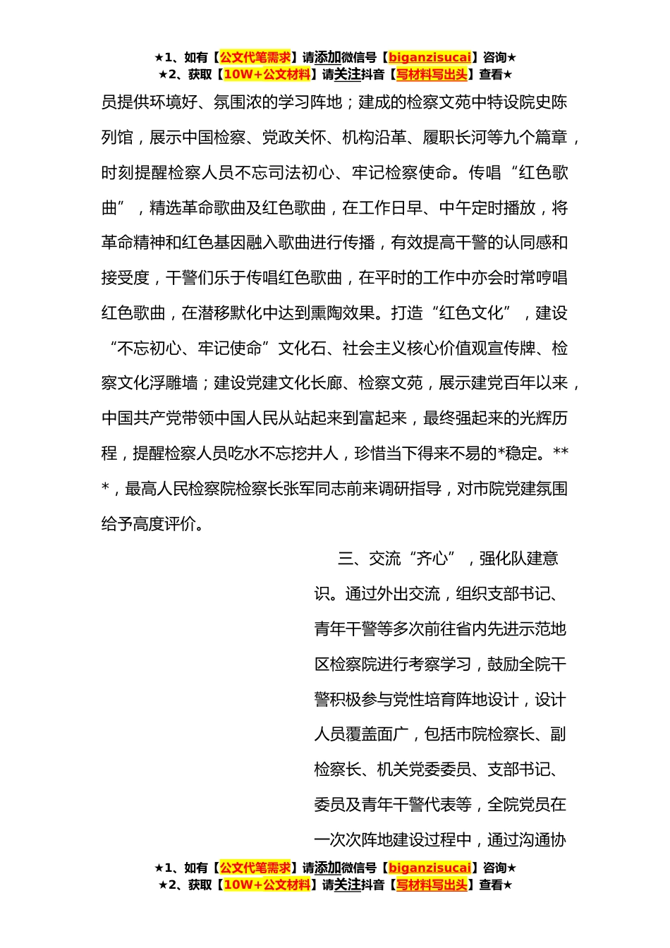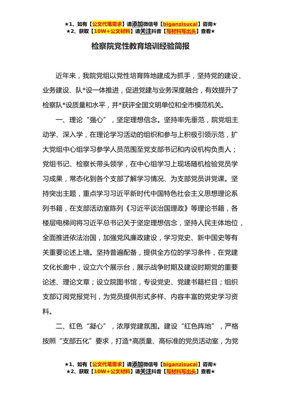 ★1、如有【公文代笔需求】请添加微信号【biganzisucai】咨询★★2、获取【10W+公文材料】请关注抖音【写材料写出头】查看★检察院党性教育培训经验简报近年来,我院党组以党性培育阵地建成为抓手,坚持党的建设、业务建设、队*设一体推进,促进党建与业务深度融合,有效提升了检察队*设质量和水平,并*获评全国文明单位和全市模范机关。一、理论“强心”,坚定理想信念。坚持率先垂范,院党组主动学、深入学,在理论学习活动的组织和参与上积极引领示范,扩大党组中心组学习参学人员范围至党支部书记和内设机构负责人;党组书记、检察长带头领学,在中心组学习上现场随机检验党员学习成果,常态化到各个支部了解学习情况、为支部党员讲党课。坚持突出主题,重点学习习近平新时代中国特色社会主义思想理论系列书籍...