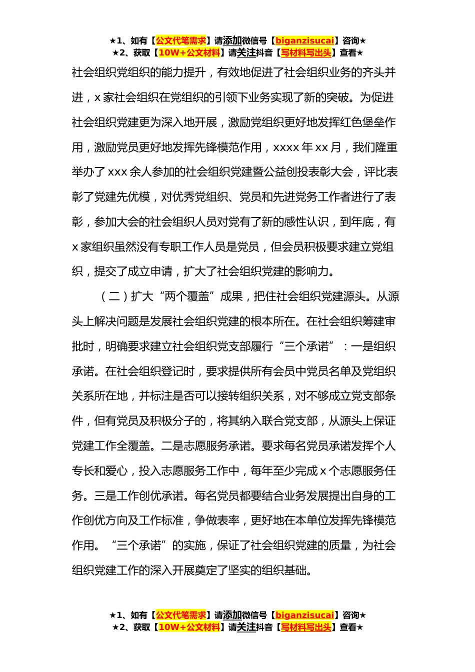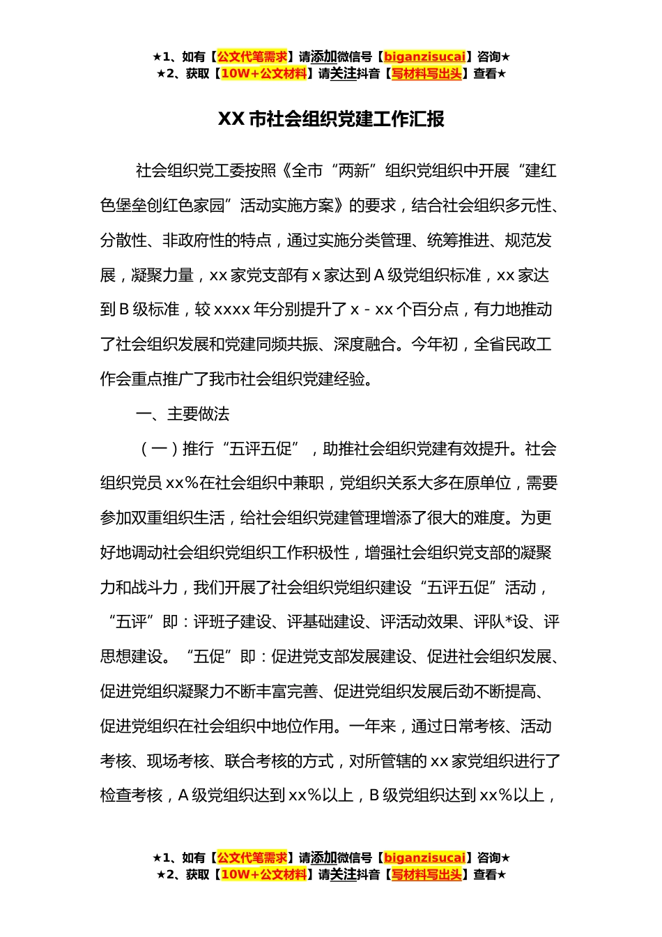 ★1、如有【公文代笔需求】请添加微信号【biganzisucai】咨询★★2、获取【10W+公文材料】请关注抖音【写材料写出头】查看★XX市社会组织党建工作汇报社会组织党工委按照《全市“两新”组织党组织中开展“建红色堡垒创红色家园”活动实施方案》的要求,结合社会组织多元性、分散性、非政府性的特点,通过实施分类管理、统筹推进、规范发展,凝聚力量,xx家党支部有x家达到A级党组织标准,xx家达到B级标准,较xxxx年分别提升了x-xx个百分点,有力地推动了社会组织发展和党建同频共振、深度融合。今年初,全省民政工作会重点推广了我市社会组织党建经验。一、主要做法(一)推行“五评五促”,助推社会组织党建有效提升。社会组织党员xx%在社会组织中兼职,党组织关系大多在原单位,需要参加双重组织生活,给社会...