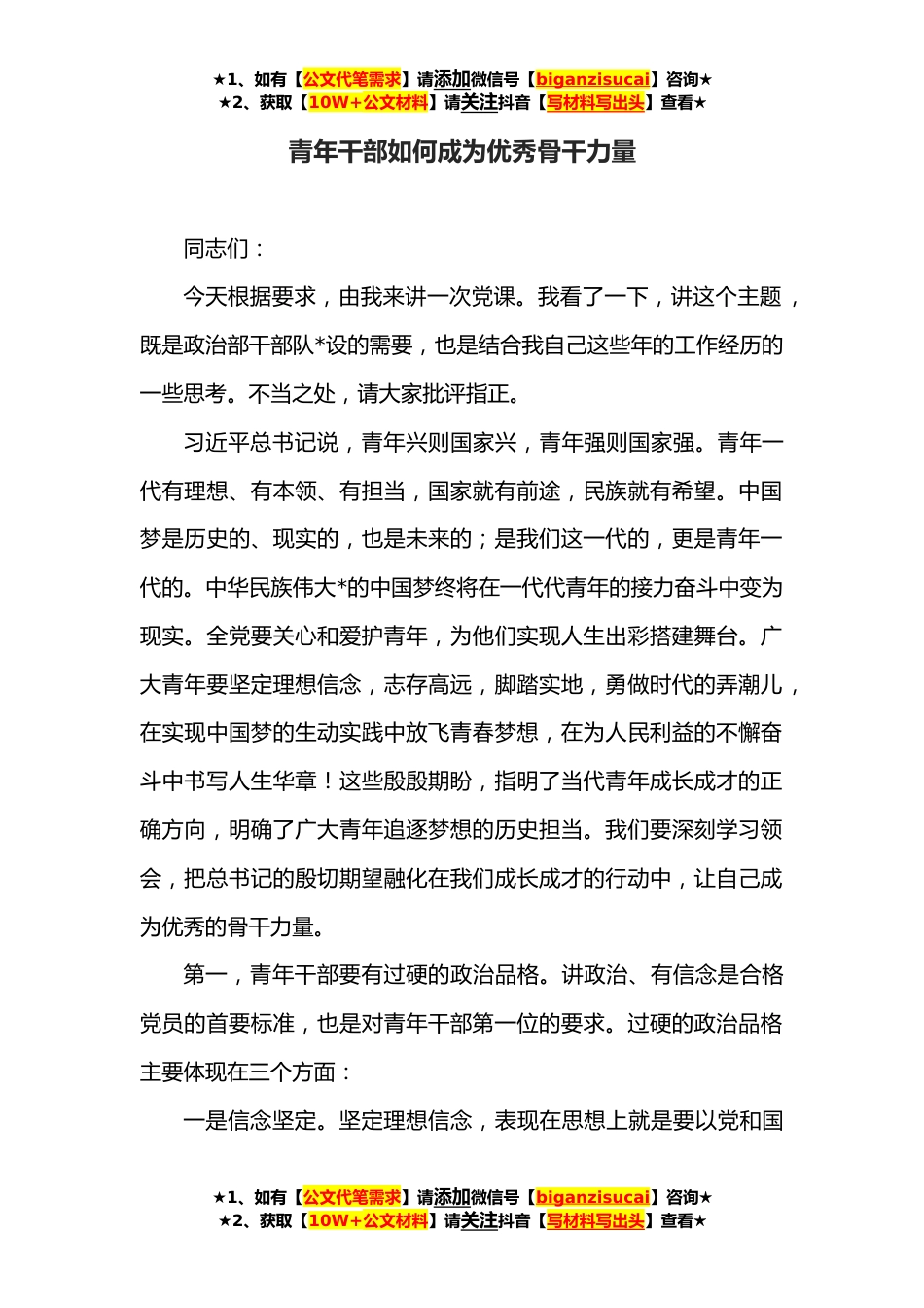 ★1、如有【公文代笔需求】请添加微信号【biganzisucai】咨询★★2、获取【10W+公文材料】请关注抖音【写材料写出头】查看★青年干部如何成为优秀骨干力量同志们:今天根据要求,由我来讲一次党课。我看了一下,讲这个主题,既是政治部干部队*设的需要,也是结合我自己这些年的工作经历的一些思考。不当之处,请大家批评指正。习近平总书记说,青年兴则国家兴,青年强则国家强。青年一代有理想、有本领、有担当,国家就有前途,民族就有希望。中国梦是历史的、现实的,也是未来的;是我们这一代的,更是青年一代的。中华民族伟大*的中国梦终将在一代代青年的接力奋斗中变为现实。全党要关心和爱护青年,为他们实现人生出彩搭建舞台。广大青年要坚定理想信念,志存高远,脚踏实地,勇做时代的弄潮儿,在实现中国梦...