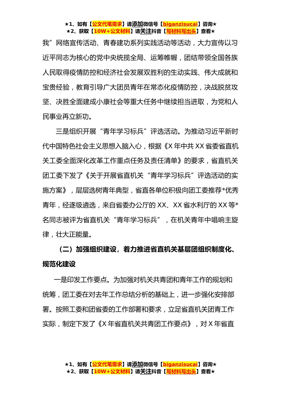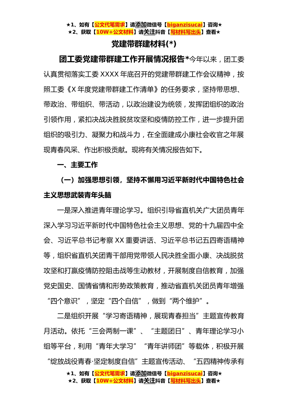 ★1、如有【公文代笔需求】请添加微信号【biganzisucai】咨询★★2、获取【10W+公文材料】请关注抖音【写材料写出头】查看★党建带群建材料(*)团工委党建带群建工作开展情况报告*今年以来,团工委认真贯彻落实工委XXXX年底召开的党建带群建工作会议精神,按照工委《X年度党建带群建工作清单》的任务要求,坚持带思想、带政治、带组织、带活动,以政治建设为统领,发挥团组织的政治引领作用,紧扣决战决胜脱贫攻坚和疫情防控工作,进一步提升团组织的吸引力、凝聚力和战斗力,在全面建成小康社会收官之年展现青春风采、作出积极贡献。现将有关情况报告如下。一、主要工作(一)加强思想引领,坚持不懈用习近平新时代中国特色社会主义思想武装青年头脑一是深入推进青年理论学习。组织引导省直机关广大团员青年深入学...