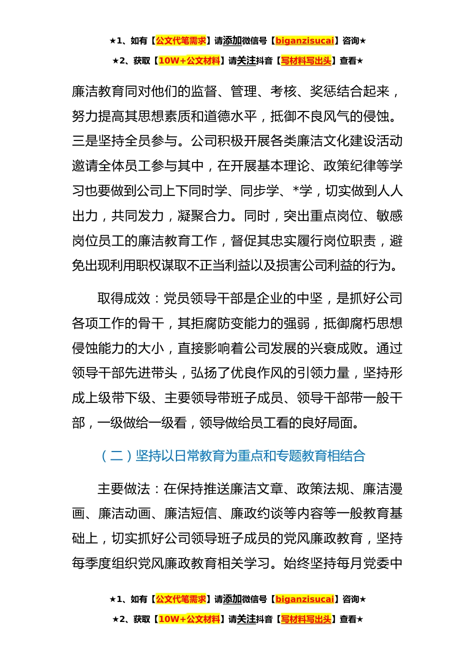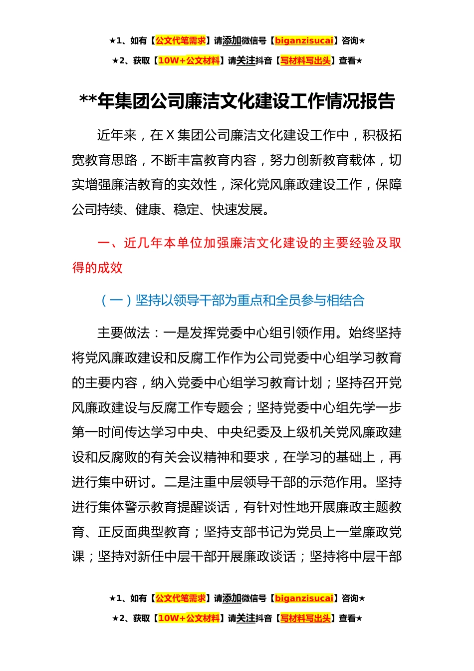 ★1、如有【公文代笔需求】请添加微信号【biganzisucai】咨询★★2、获取【10W+公文材料】请关注抖音【写材料写出头】查看★**年集团公司廉洁文化建设工作情况报告近年来,在X集团公司廉洁文化建设工作中,积极拓宽教育思路,不断丰富教育内容,努力创新教育载体,切实增强廉洁教育的实效性,深化党风廉政建设工作,保障公司持续、健康、稳定、快速发展。一、近几年本单位加强廉洁文化建设的主要经验及取得的成效(一)坚持以领导干部为重点和全员参与相结合主要做法:一是发挥党委中心组引领作用。始终坚持将党风廉政建设和反腐工作作为公司党委中心组学习教育的主要内容,纳入党委中心组学习教育计划;坚持召开党风廉政建设与反腐工作专题会;坚持党委中心组先学一步第一时间传达学习中央、中央纪委及上级机关党...