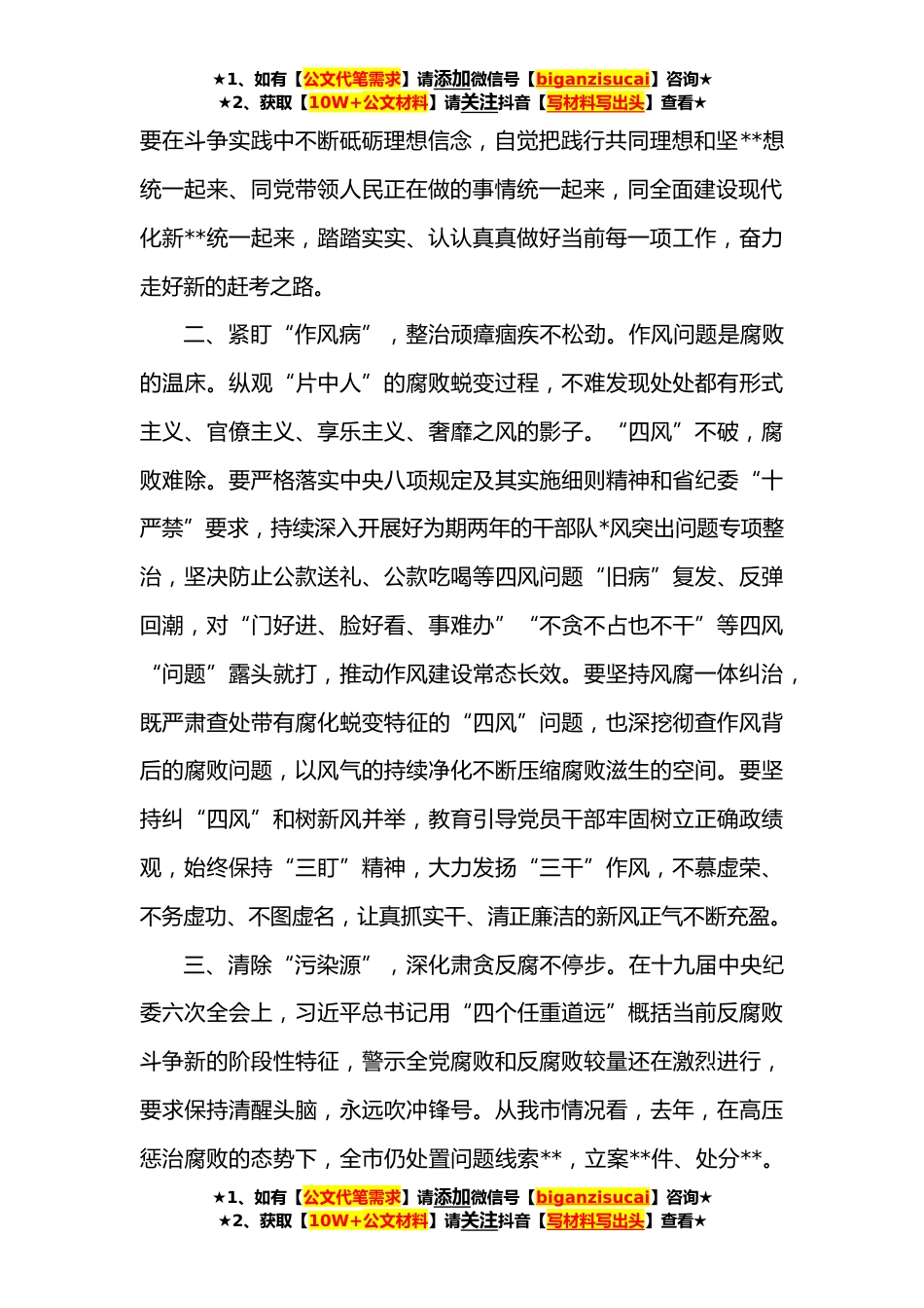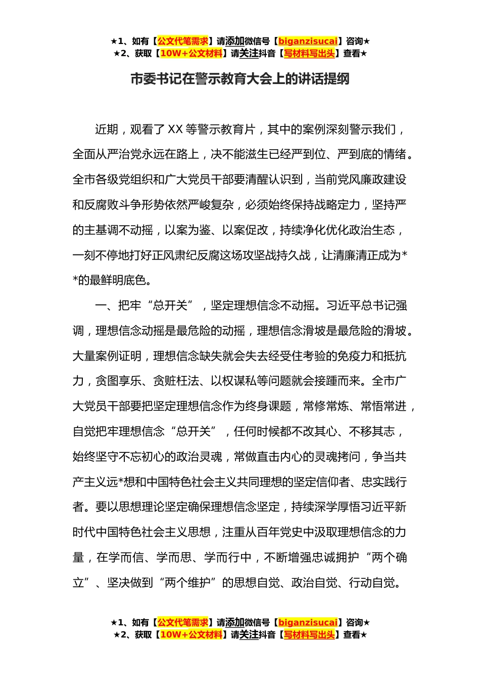 ★1、如有【公文代笔需求】请添加微信号【biganzisucai】咨询★★2、获取【10W+公文材料】请关注抖音【写材料写出头】查看★市委书记在警示教育大会上的讲话提纲近期,观看了XX等警示教育片,其中的案例深刻警示我们,全面从严治党永远在路上,决不能滋生已经严到位、严到底的情绪。全市各级党组织和广大党员干部要清醒认识到,当前党风廉政建设和反腐败斗争形势依然严峻复杂,必须始终保持战略定力,坚持严的主基调不动摇,以案为鉴、以案促改,持续净化优化政治生态,一刻不停地打好正风肃纪反腐这场攻坚战持久战,让清廉清正成为**的最鲜明底色。一、把牢“总开关”,坚定理想信念不动摇。习近平总书记强调,理想信念动摇是最危险的动摇,理想信念滑坡是最危险的滑坡。大量案例证明,理想信念缺失就会失去经受...