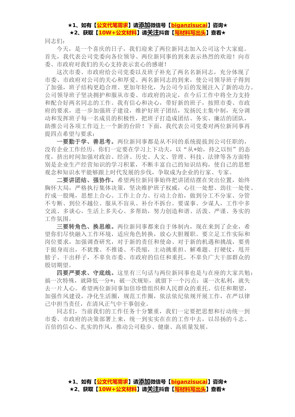 ★1、如有【公文代笔需求】请添加微信号【biganzisucai】咨询★★2、获取【10W+公文材料】请关注抖音【写材料写出头】查看★同志们:今天,是一个喜庆的日子,我们迎来了两位新同志加入公司这个大家庭。首先,我代表公司党委向各位领导、两位新同事的到来表示热烈的欢迎!向市委、市政府对我们的关心支持表示衷心的感谢!这次市委、市政府给公司党委以及班子补充了两名名新同志,充分体现了市委、市政府对公司的关心和厚爱。两名新同志的到来,使公司领导班子得到了加强,班子结构更趋合理、更加年轻化,为公司今后的发展注入了新的动力。公司领导班子坚决拥护和服从市委、市政府的决定,在今后工作中将全力支持和配合好两名同志的工作。我有信心和决心,带好新的班子,按照市委、市政府的要求,进一步加强班子建...