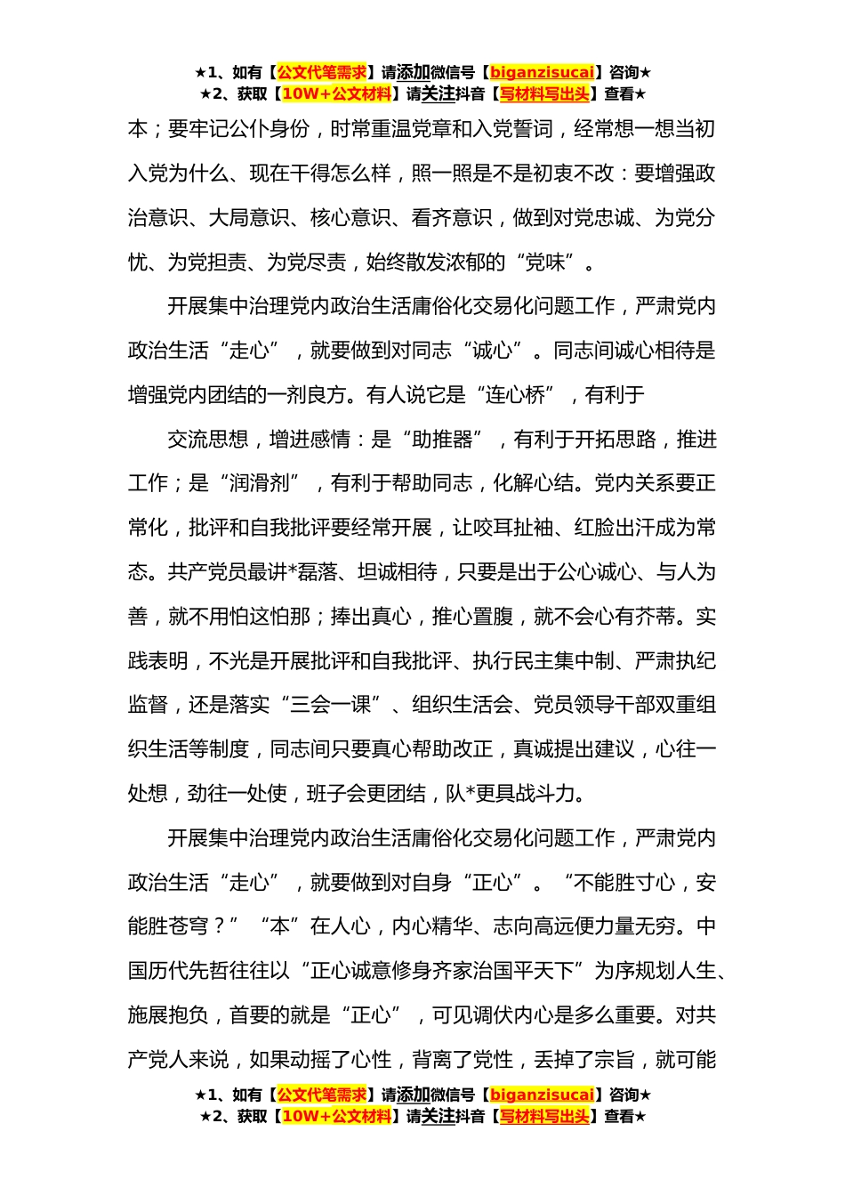 ★1、如有【公文代笔需求】请添加微信号【biganzisucai】咨询★★2、获取【10W+公文材料】请关注抖音【写材料写出头】查看★集中治理党内政治生活庸俗化交易化问题研讨交流发言日前,XX镇党委召开集中治理党内政治生活庸俗化交易化问题动员部署会。学习传达自治区党委、市委、旗委有关文件及会议精神,宣读《XX镇关于集中治理全旗党内政治生活庸俗化交易化问题的工作方案》,通报党内政治生活庸俗化交易化问题清单。根据相关要求,我深入学习了习总书记关于严肃党内政治生活重要论述,认真学习《关于新形势下党内政治生活的若干准则》,对开展集中治理党内政治生活庸俗化交易化问题工作,严肃党内政治生活作如下交流:开展集中治理党内政治生活庸俗化交易化问题工作,严肃党内政治生活是全面从严治党的重要基础工...