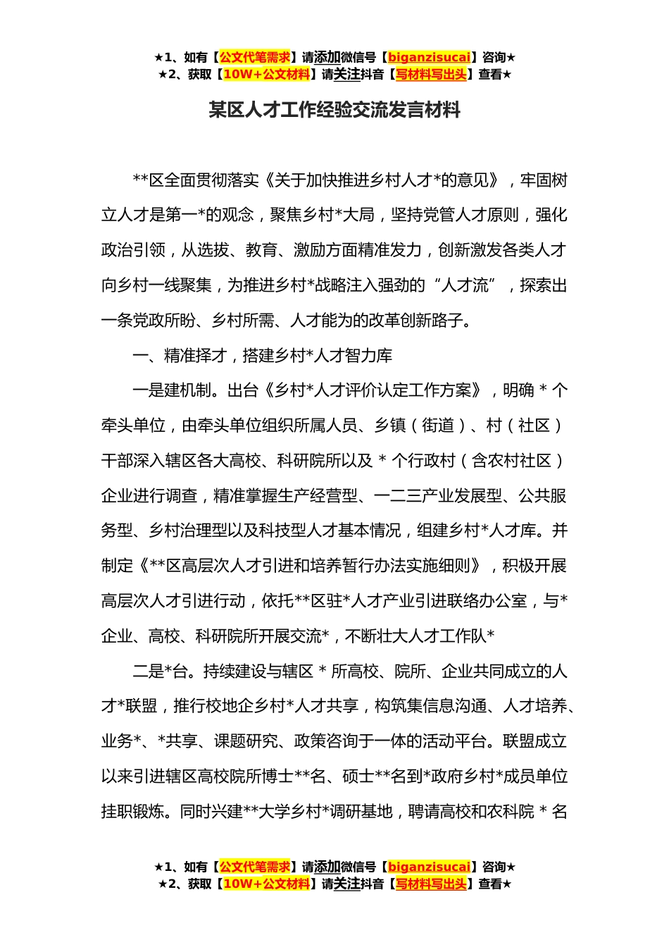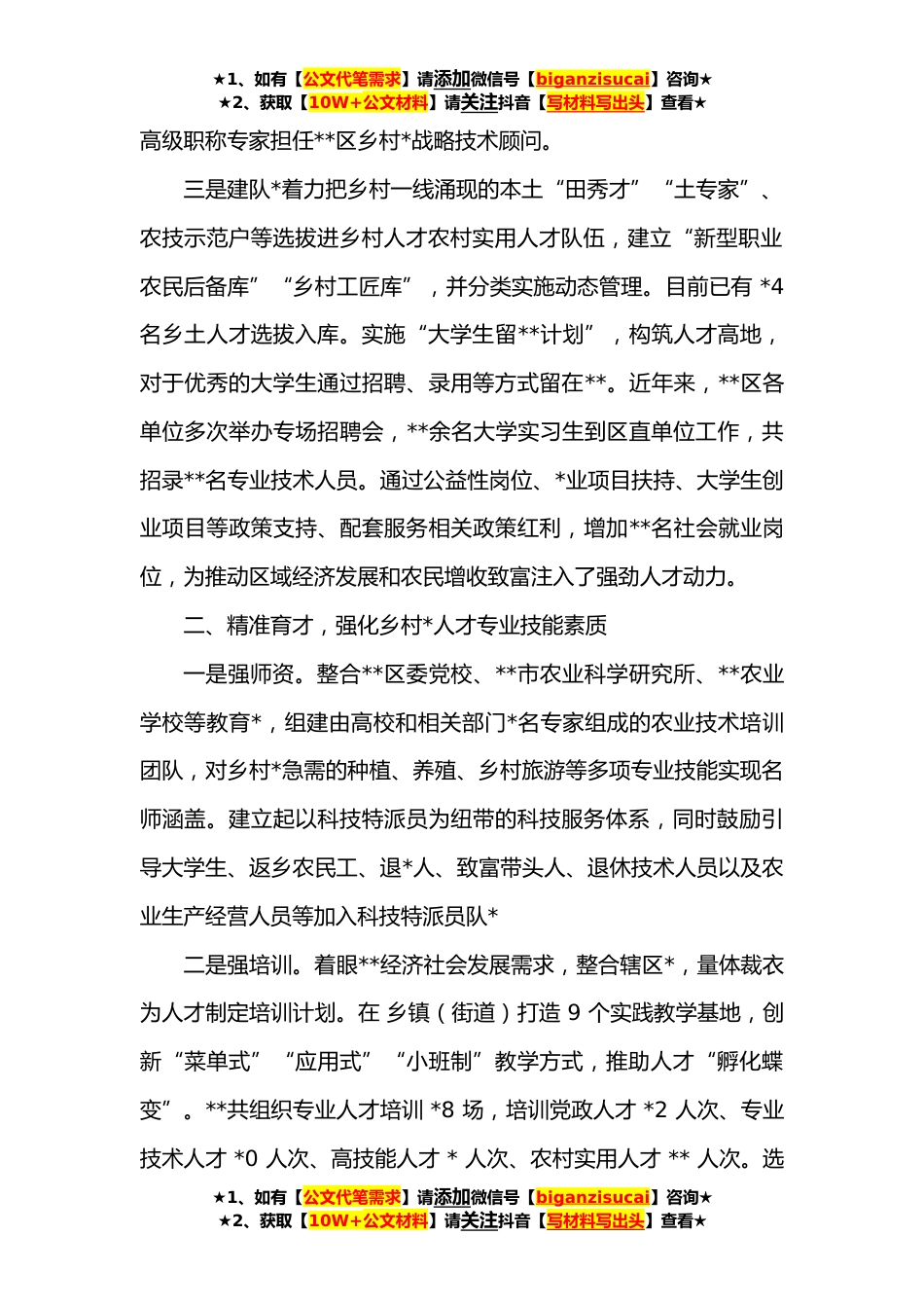★1、如有【公文代笔需求】请添加微信号【biganzisucai】咨询★★2、获取【10W+公文材料】请关注抖音【写材料写出头】查看★某区人才工作经验交流发言材料**区全面贯彻落实《关于加快推进乡村人才*的意见》,牢固树立人才是第一*的观念,聚焦乡村*大局,坚持党管人才原则,强化政治引领,从选拔、教育、激励方面精准发力,创新激发各类人才向乡村一线聚集,为推进乡村*战略注入强劲的“人才流”,探索出一条党政所盼、乡村所需、人才能为的改革创新路子。一、精准择才,搭建乡村*人才智力库一是建机制。出台《乡村*人才评价认定工作方案》,明确*个牵头单位,由牵头单位组织所属人员、乡镇(街道)、村(社区)干部深入辖区各大高校、科研院所以及*个行政村(含农村社区)企业进行调查,精准掌握生产经营型、一二...