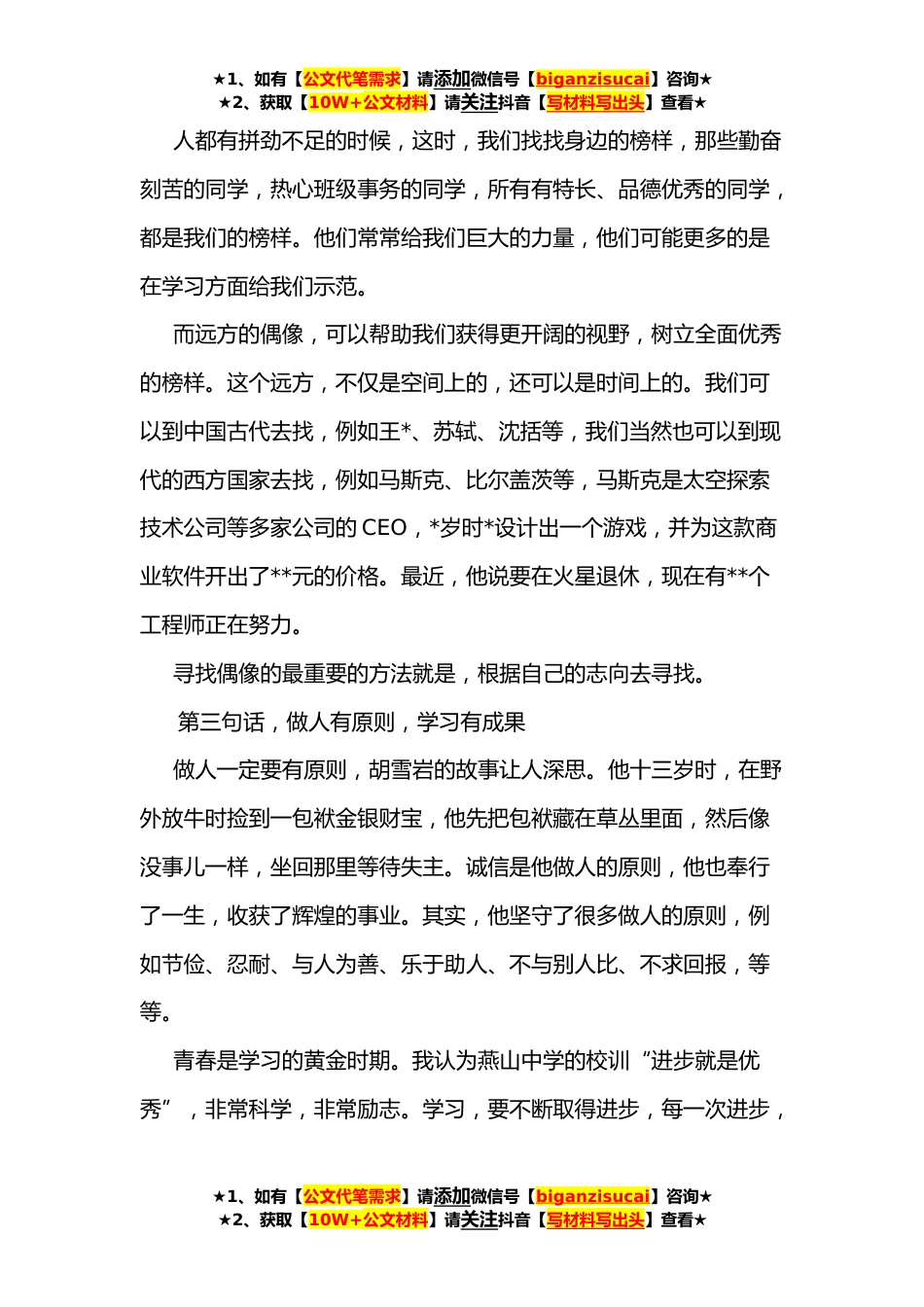 ★1、如有【公文代笔需求】请添加微信号【biganzisucai】咨询★★2、获取【10W+公文材料】请关注抖音【写材料写出头】查看★在中学“青春仪式”上的发言稿尊敬的学校领导们、老师们,可爱的同学们:你们好!今天,能够将我对青春的理解分享给你们,是一种荣幸,是一种缘分,是一种责任。我真诚地感谢学校的邀请。今天学校如此隆重举行青春仪式,我也代表所有家长感谢学校的用心良苦和精心组织。作为一名父亲,我最希望自己的孩子拥有怎样的青春呢?我把自己的思考,归纳为这样三句话。第一句话,胸中有热血,心中有志向王*十三岁时,母亲去世,他受到很大挫折,但他志存高远。一次,与老师讨论何为天下最要紧之事,他认为“科举并非第一等要紧事”,最要紧的是读书做一个圣贤的人。当时国家朝政腐败,义军四起。英...