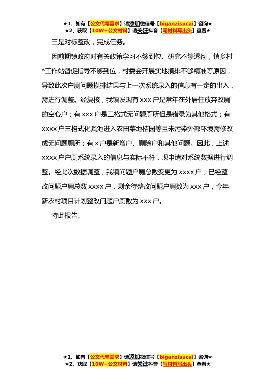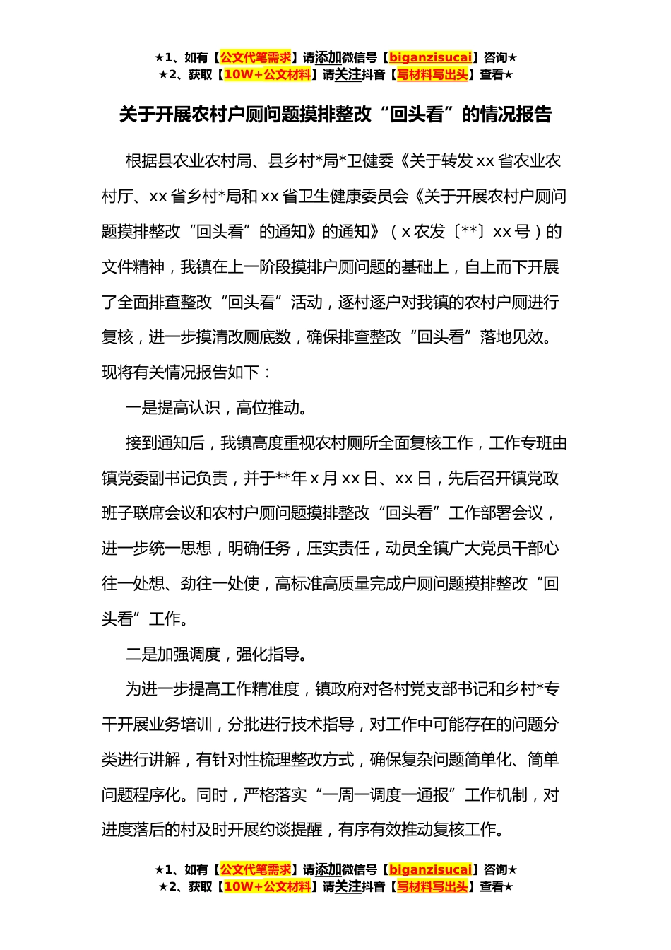 ★1、如有【公文代笔需求】请添加微信号【biganzisucai】咨询★★2、获取【10W+公文材料】请关注抖音【写材料写出头】查看★关于开展农村户厕问题摸排整改“回头看”的情况报告根据县农业农村局、县乡村*局*卫健委《关于转发xx省农业农村厅、xx省乡村*局和xx省卫生健康委员会《关于开展农村户厕问题摸排整改“回头看”的通知》的通知》(x农发〔**〕xx号)的文件精神,我镇在上一阶段摸排户厕问题的基础上,自上而下开展了全面排查整改“回头看”活动,逐村逐户对我镇的农村户厕进行复核,进一步摸清改厕底数,确保排查整改“回头看”落地见效。现将有关情况报告如下:一是提高认识,高位推动。接到通知后,我镇高度重视农村厕所全面复核工作,工作专班由镇党委副书记负责,并于**年x月xx日、xx日,先后召开镇党政...