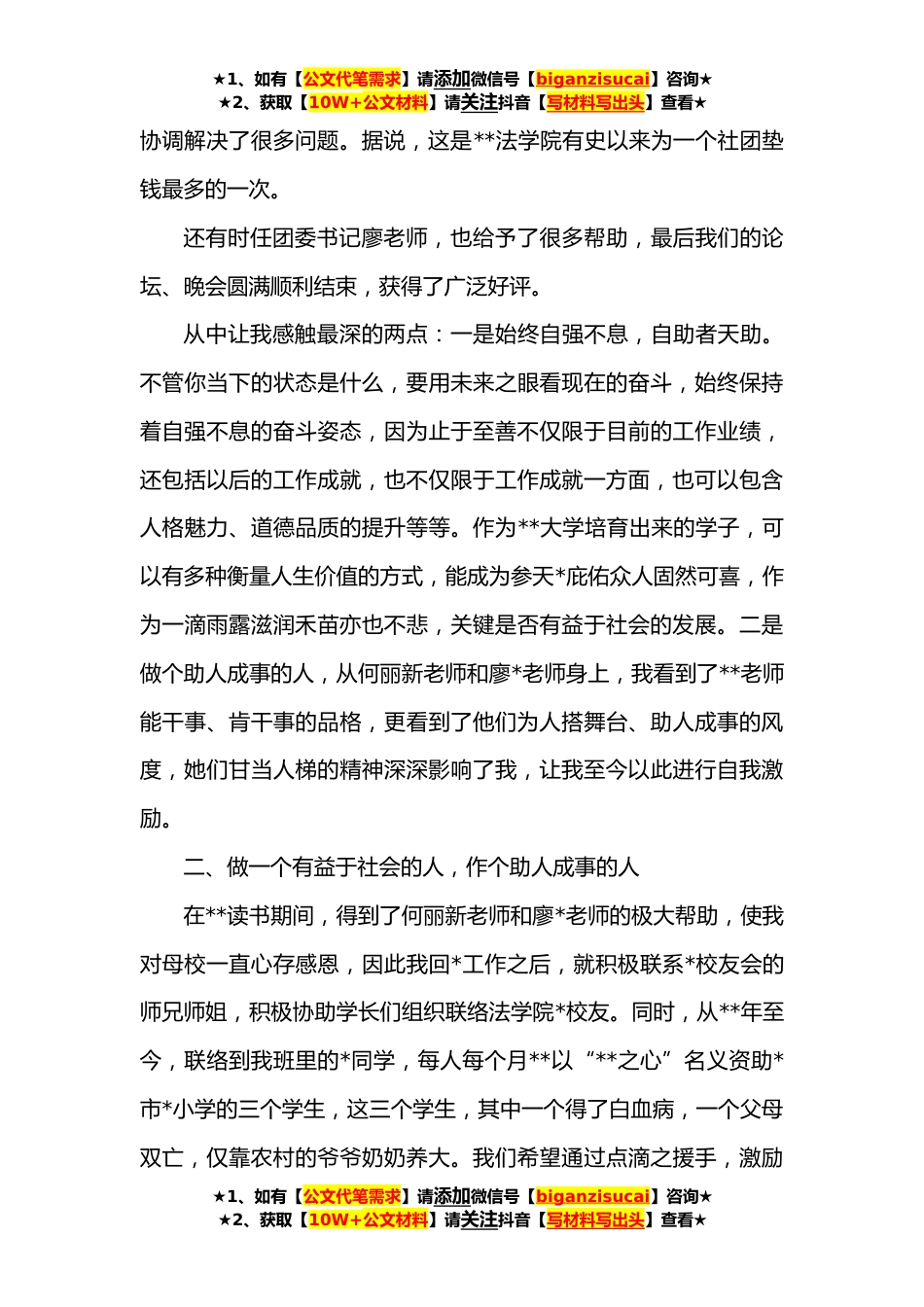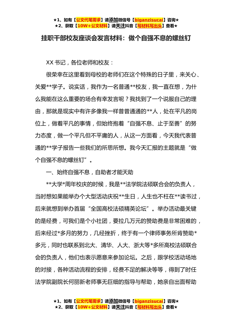 ★1、如有【公文代笔需求】请添加微信号【biganzisucai】咨询★★2、获取【10W+公文材料】请关注抖音【写材料写出头】查看★挂职干部校友座谈会发言材料:做个自强不息的螺丝钉XX书记,各位老师和校友:很荣幸在这里看到母校的老师们在这个特殊的日子里,来关心、关爱**学子。说实话,我作为一名普通**校友,我一直在想,为什么我能在这么重要的场合有幸发言呢?我找到了一个说服自己的理由,那就是现实中有许多像我一样普普通通的**人,处在平凡的岗位上,做着平凡的事情,但始终抱着“自强不息、止于至善”的努力态度,做一个平凡但不平庸的人,从这一方面看,今天我代表普通的**学子报告一些我们的所思所想。我今天汇报的主题就是“做个自强不息的螺丝钉”。一、始终自强不息,自助者才能天助**大学*周年校庆的...
