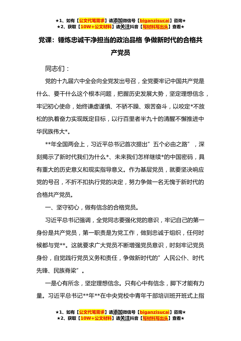 ★1、如有【公文代笔需求】请添加微信号【biganzisucai】咨询★★2、获取【10W+公文材料】请关注抖音【写材料写出头】查看★党课:锤炼忠诚干净担当的政治品格争做新时代的合格共产党员同志们:党的十九届六中全会向全党发出号召,全党要牢记中国共产党是什么、要干什么这个根本问题,把握历史发展大势,坚定理想信念,牢记初心使命,始终谦虚谨慎、不骄不躁、艰苦奋斗,以咬定*不放松的执着奋力实现既定目标,以行百里者半九十的清醒不懈推进中华民族伟大*。**年全国两会上,习近平总书记首次提出”五个必由之路”,深刻揭示了新时代我们为什么*、未来我们怎样继续*的中国密码,具有重大的历史意义和现实指导意义。作为基层党员,就要坚决响应党的号召,不折不扣执行党的决定,努力争做一名无愧于新时代的合格共...