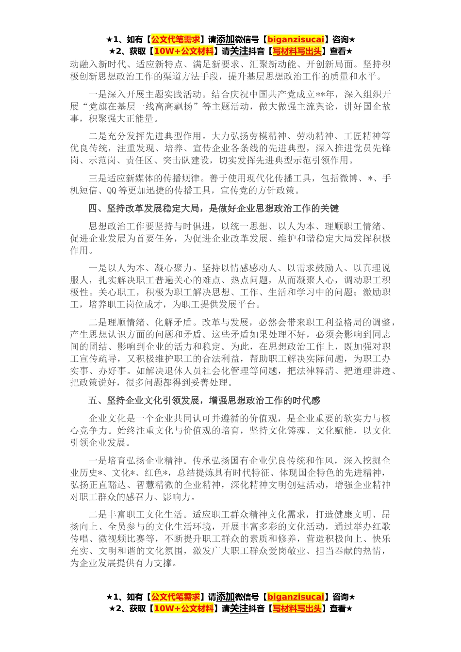 ★1、如有【公文代笔需求】请添加微信号【biganzisucai】咨询★★2、获取【10W+公文材料】请关注抖音【写材料写出头】查看★近年来,坚持把加强和改进思想政治工作作为一项重大政治任务和经常性、基础性工作,积极推进思想政治工作创新,汇聚推动企业高质量发展的强大动力,对新时代加强和改进思想政治工作进行了有益的实践探索。一、坚持思想政治教育与中心工作有机结合,是做好企业思想政治工作的根本自觉承担起举旗帜、聚民心、育新人、*化、展形象的职责使命,把思想政治工作融入企业生产经营全过程,持续激发职工群众干事创业的活力和热情。一是坚持抓“关键少数”,认真落实第一议题制度、党组(党委)理论学习中心组学习制度,持续开展干部“双月读书会(班)”,通过党员领导干部的领学促学,带动全体干部...