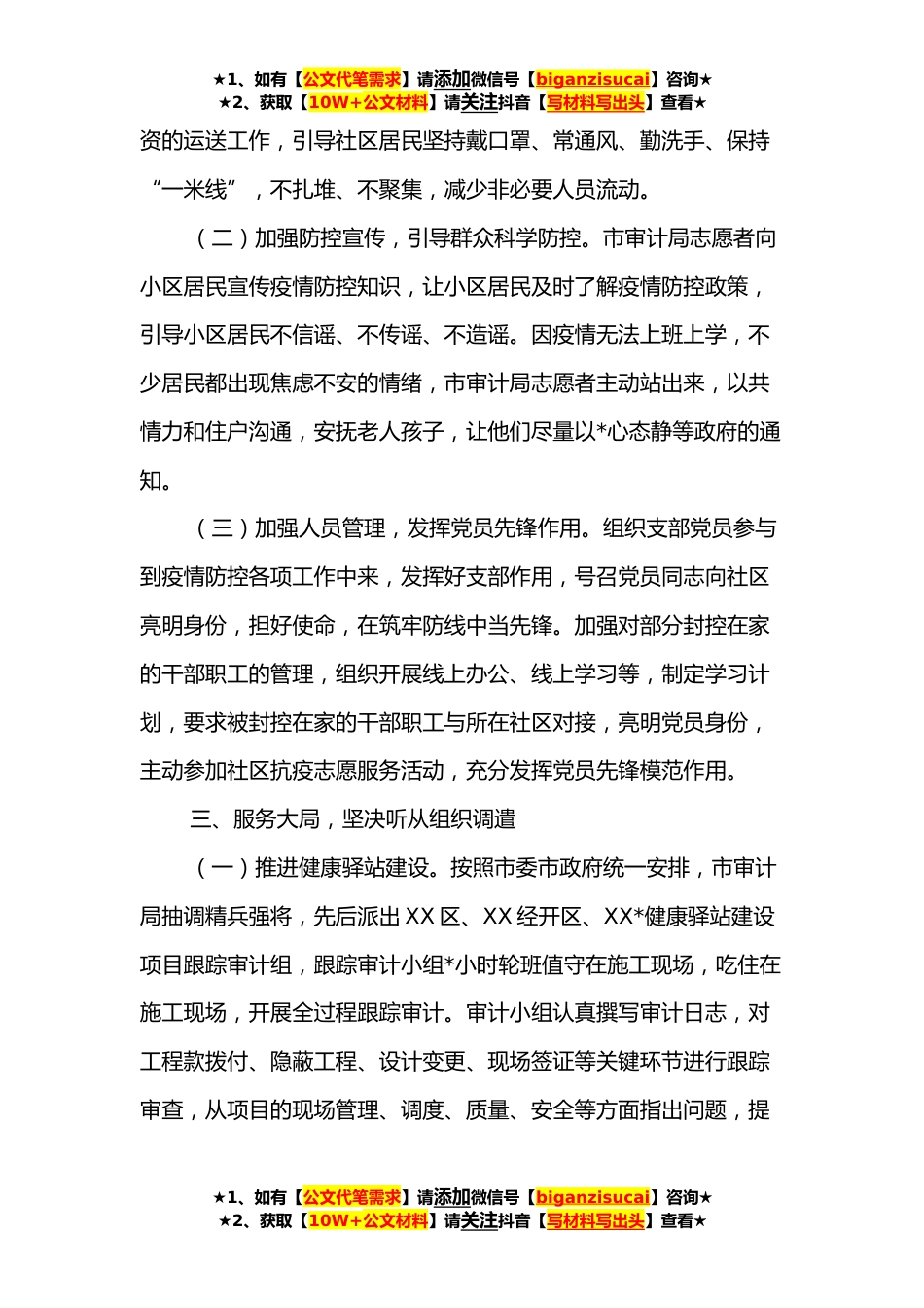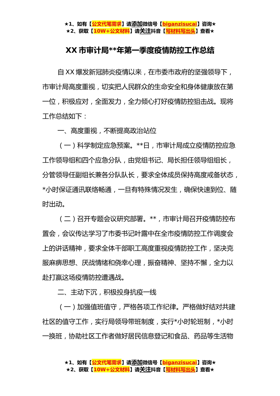 ★1、如有【公文代笔需求】请添加微信号【biganzisucai】咨询★★2、获取【10W+公文材料】请关注抖音【写材料写出头】查看★XX市审计局**年第一季度疫情防控工作总结自XX爆发新冠肺炎疫情以来,在市委市政府的坚强领导下,市审计局高度重视,切实把人民群众的生命安全和身体健康放在第一位,积极应对,全面发力,全力倾心打好疫情防控狙击战。现将工作总结如下:一、高度重视,不断提高政治站位(一)科学制定应急预案。**日,市审计局成立疫情防控应急工作领导组和四个应急分队,由党组书记、局长担任领导组组长,分管领导任副组长兼各分队队长,要求全体成员保持高度戒备状态,*小时保证通讯联络畅通,一旦有特殊情况发生,确保快速到位、随时出动。(二)召开专题会议研究部署。**,市审计局召开疫情防控布置会...