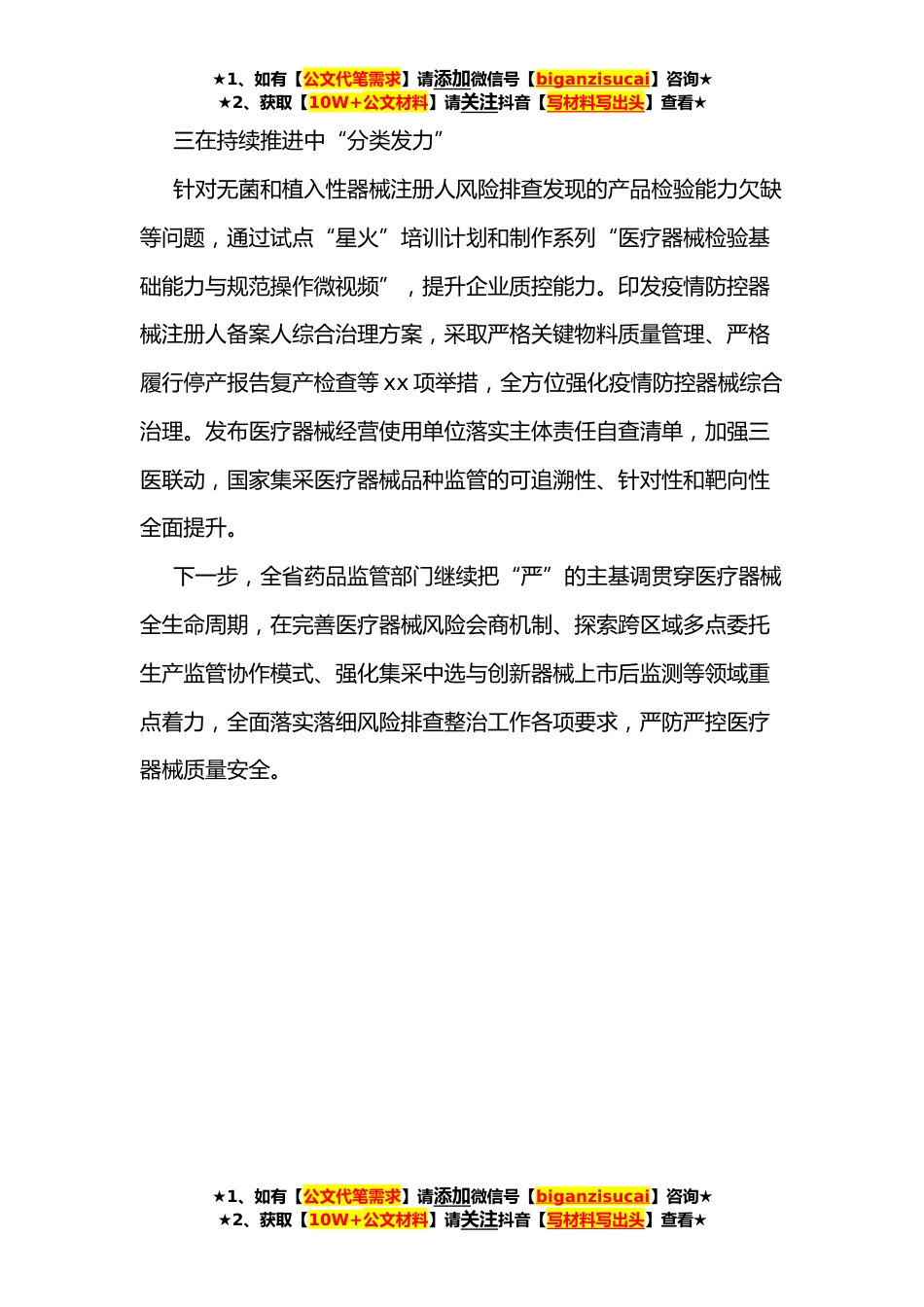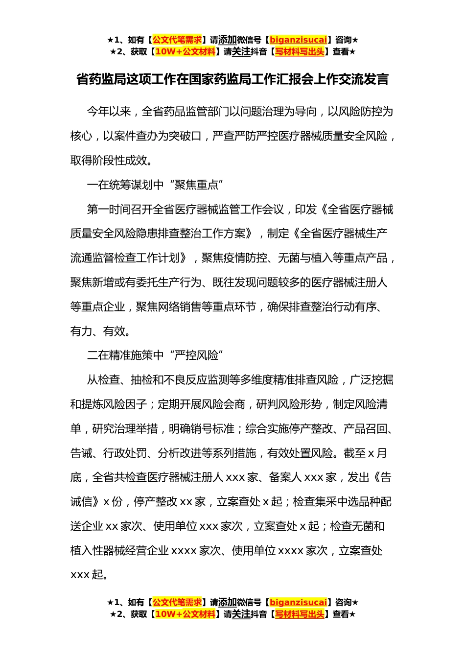 ★1、如有【公文代笔需求】请添加微信号【biganzisucai】咨询★★2、获取【10W+公文材料】请关注抖音【写材料写出头】查看★省药监局这项工作在国家药监局工作汇报会上作交流发言今年以来,全省药品监管部门以问题治理为导向,以风险防控为核心,以案件查办为突破口,严查严防严控医疗器械质量安全风险,取得阶段性成效。一在统筹谋划中“聚焦重点”第一时间召开全省医疗器械监管工作会议,印发《全省医疗器械质量安全风险隐患排查整治工作方案》,制定《全省医疗器械生产流通监督检查工作计划》,聚焦疫情防控、无菌与植入等重点产品,聚焦新增或有委托生产行为、既往发现问题较多的医疗器械注册人等重点企业,聚焦网络销售等重点环节,确保排查整治行动有序、有力、有效。二在精准施策中“严控风险”从检查、抽...