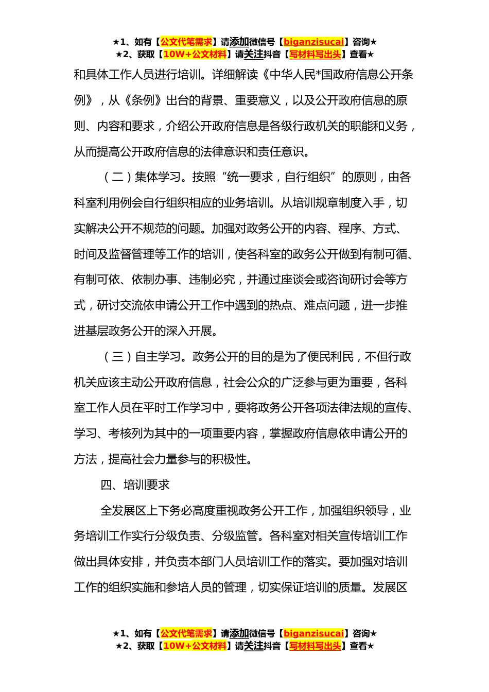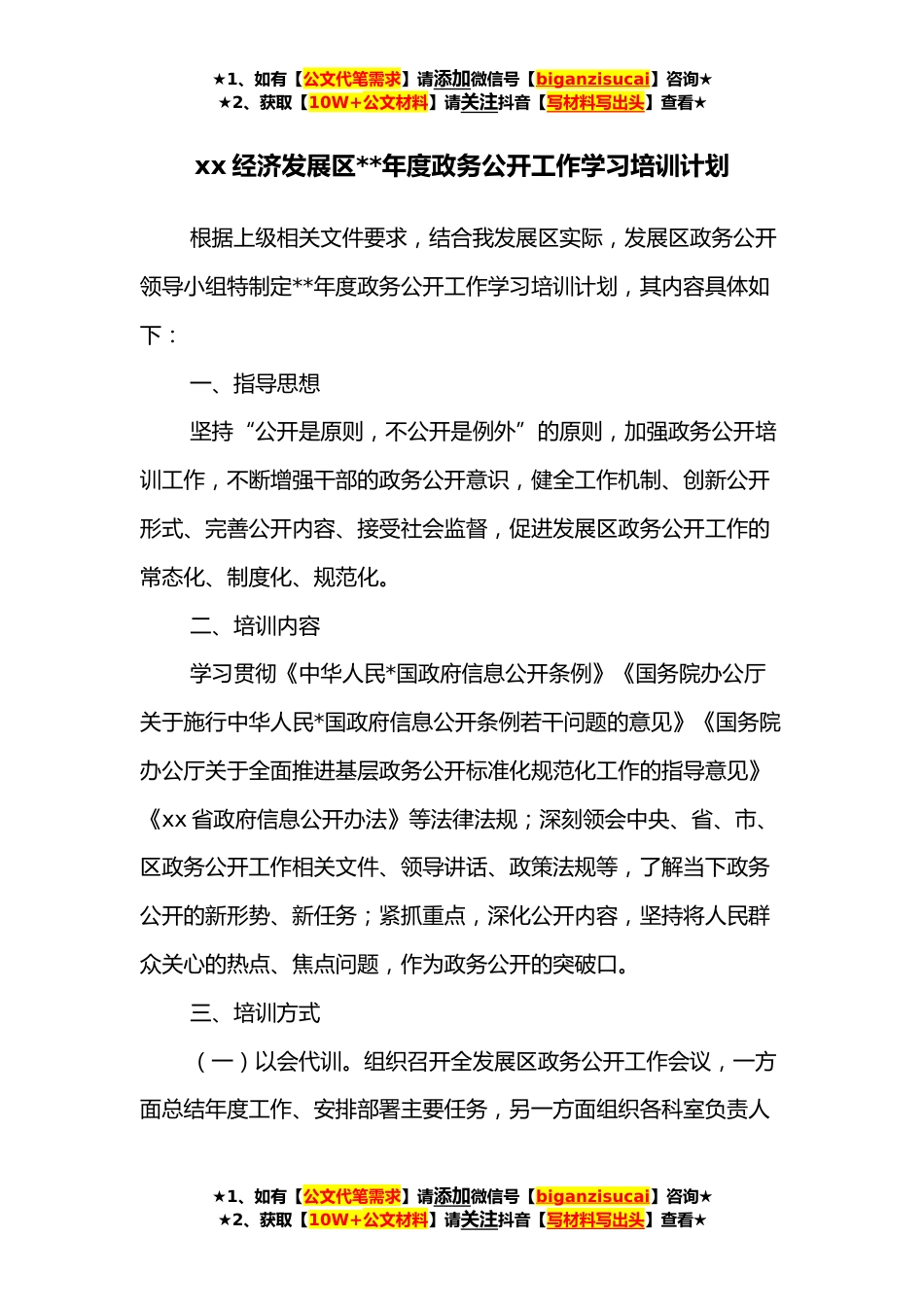 ★1、如有【公文代笔需求】请添加微信号【biganzisucai】咨询★★2、获取【10W+公文材料】请关注抖音【写材料写出头】查看★xx经济发展区**年度政务公开工作学习培训计划根据上级相关文件要求,结合我发展区实际,发展区政务公开领导小组特制定**年度政务公开工作学习培训计划,其内容具体如下:一、指导思想坚持“公开是原则,不公开是例外”的原则,加强政务公开培训工作,不断增强干部的政务公开意识,健全工作机制、创新公开形式、完善公开内容、接受社会监督,促进发展区政务公开工作的常态化、制度化、规范化。二、培训内容学习贯彻《中华人民*国政府信息公开条例》《国务院办公厅关于施行中华人民*国政府信息公开条例若干问题的意见》《国务院办公厅关于全面推进基层政务公开标准化规范化工作的指导意见》...