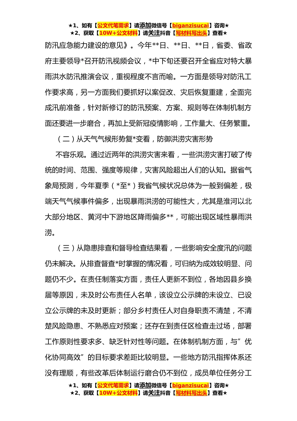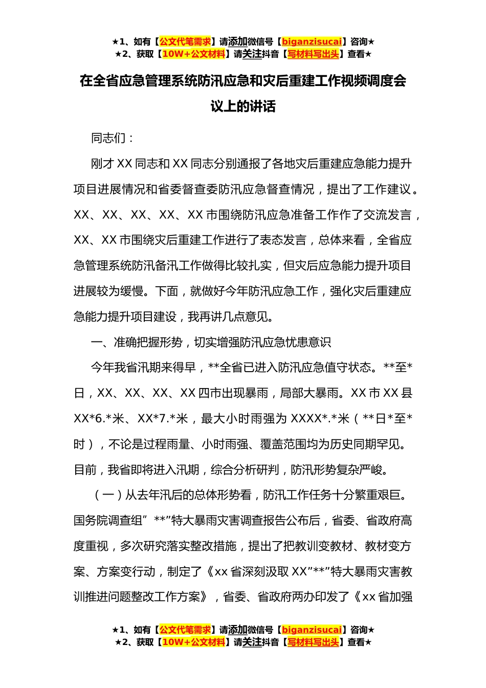 ★1、如有【公文代笔需求】请添加微信号【biganzisucai】咨询★★2、获取【10W+公文材料】请关注抖音【写材料写出头】查看★在全省应急管理系统防汛应急和灾后重建工作视频调度会议上的讲话同志们:刚才XX同志和XX同志分别通报了各地灾后重建应急能力提升项目进展情况和省委督查委防汛应急督查情况,提出了工作建议。XX、XX、XX、XX、XX市围绕防汛应急准备工作作了交流发言,XX、XX市围绕灾后重建工作进行了表态发言,总体来看,全省应急管理系统防汛备汛工作做得比较扎实,但灾后应急能力提升项目进展较为缓慢。下面,就做好今年防汛应急工作,强化灾后重建应急能力提升项目建设,我再讲几点意见。一、准确把握形势,切实增强防汛应急忧患意识今年我省汛期来得早,**全省已进入防汛应急值守状态。**至*日,XX、XX...