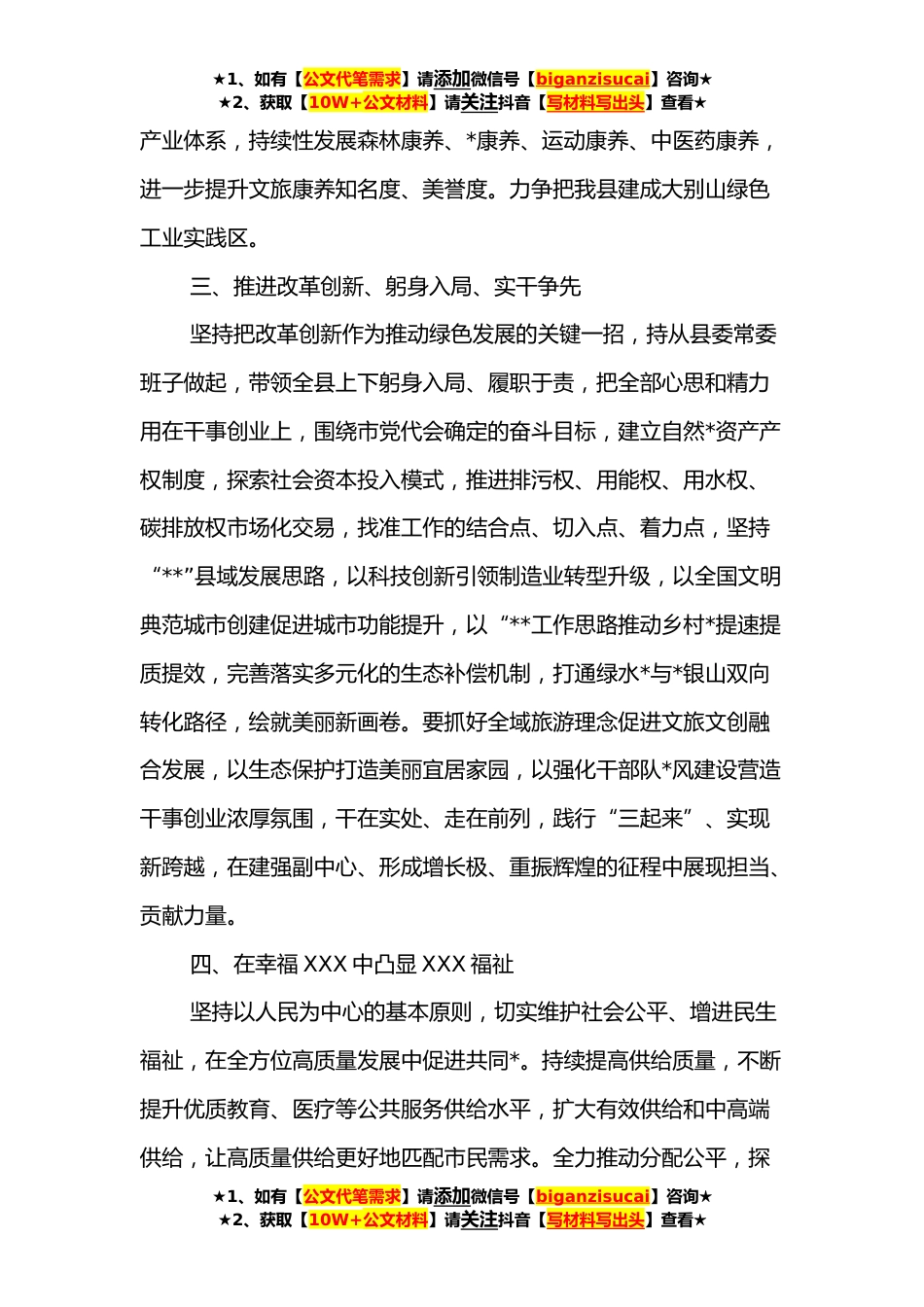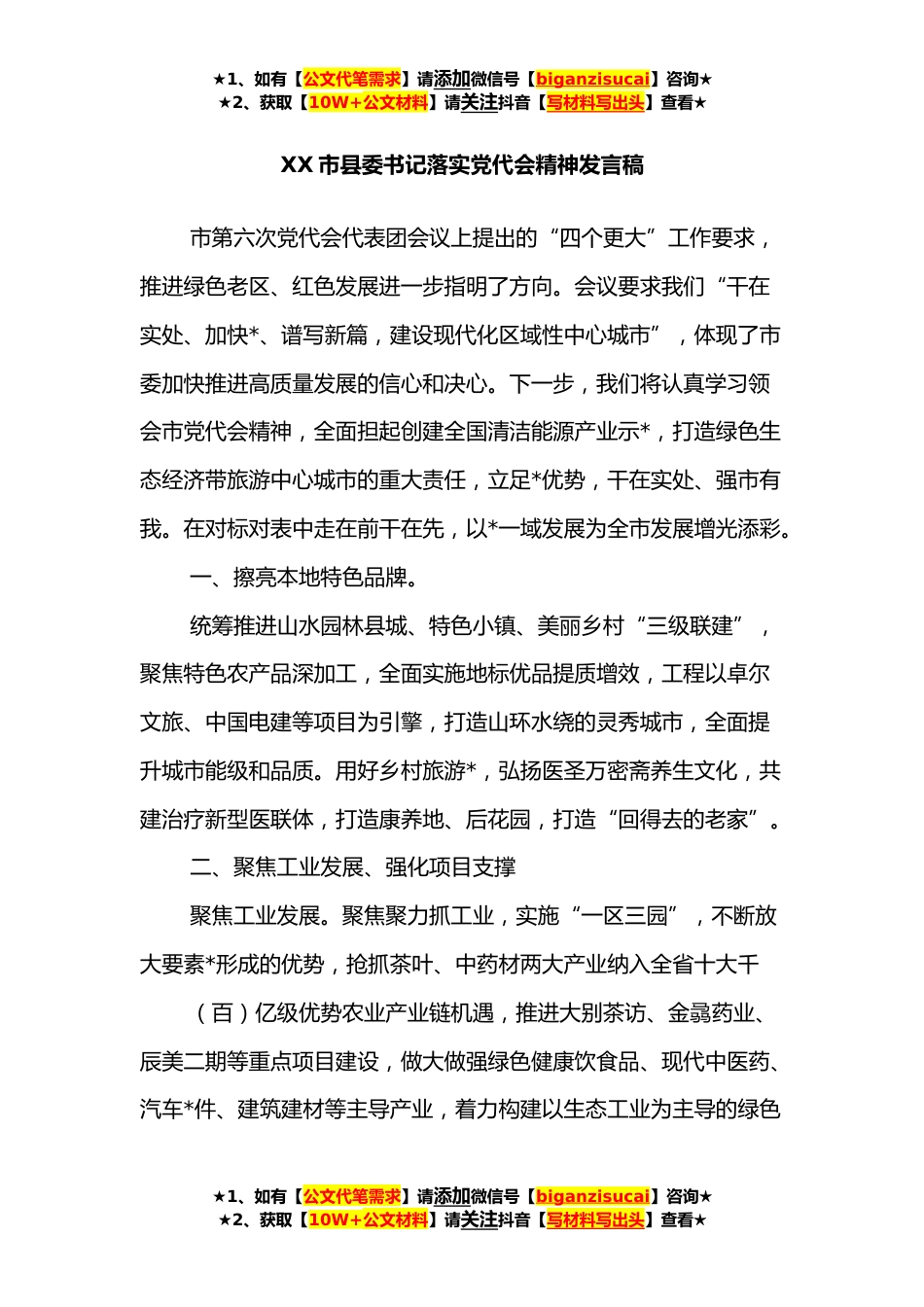 ★1、如有【公文代笔需求】请添加微信号【biganzisucai】咨询★★2、获取【10W+公文材料】请关注抖音【写材料写出头】查看★XX市县委书记落实党代会精神发言稿市第六次党代会代表团会议上提出的“四个更大”工作要求,推进绿色老区、红色发展进一步指明了方向。会议要求我们“干在实处、加快*、谱写新篇,建设现代化区域性中心城市”,体现了市委加快推进高质量发展的信心和决心。下一步,我们将认真学习领会市党代会精神,全面担起创建全国清洁能源产业示*,打造绿色生态经济带旅游中心城市的重大责任,立足*优势,干在实处、强市有我。在对标对表中走在前干在先,以*一域发展为全市发展增光添彩。一、擦亮本地特色品牌。统筹推进山水园林县城、特色小镇、美丽乡村“三级联建”,聚焦特色农产品深加工,全面实施...