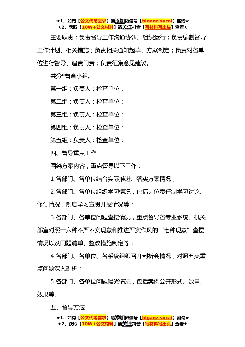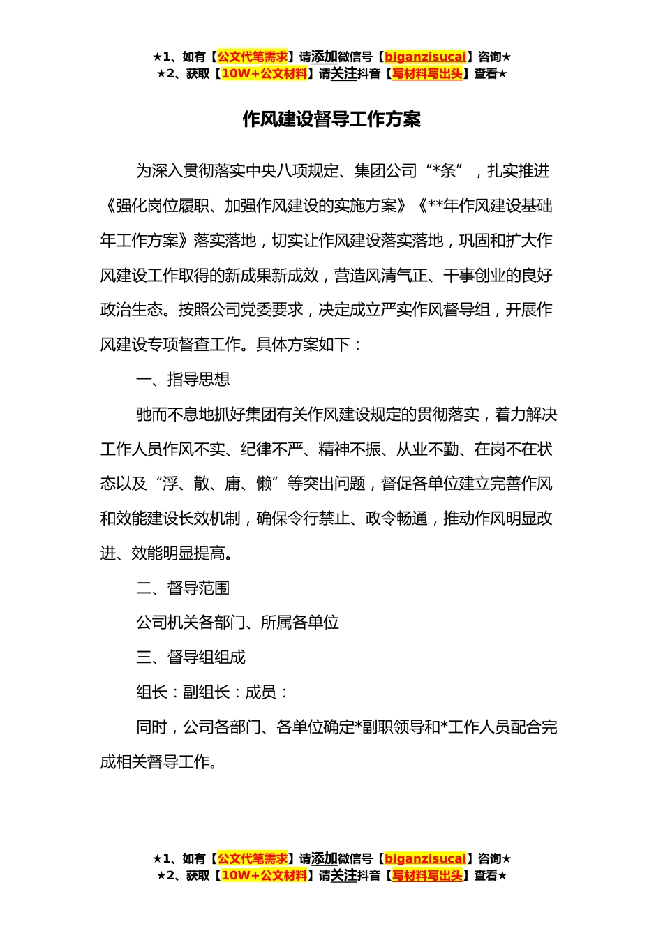 ★1、如有【公文代笔需求】请添加微信号【biganzisucai】咨询★★2、获取【10W+公文材料】请关注抖音【写材料写出头】查看★作风建设督导工作方案为深入贯彻落实中央八项规定、集团公司“*条”,扎实推进《强化岗位履职、加强作风建设的实施方案》《**年作风建设基础年工作方案》落实落地,切实让作风建设落实落地,巩固和扩大作风建设工作取得的新成果新成效,营造风清气正、干事创业的良好政治生态。按照公司党委要求,决定成立严实作风督导组,开展作风建设专项督查工作。具体方案如下:一、指导思想驰而不息地抓好集团有关作风建设规定的贯彻落实,着力解决工作人员作风不实、纪律不严、精神不振、从业不勤、在岗不在状态以及“浮、散、庸、懒”等突出问题,督促各单位建立完善作风和效能建设长效机制,确保令...