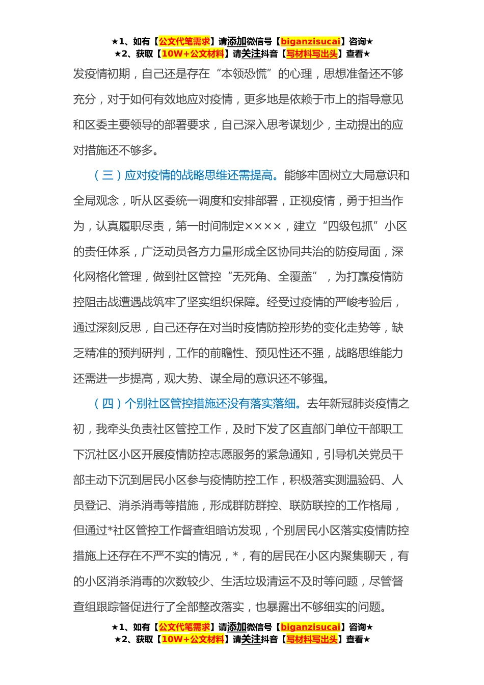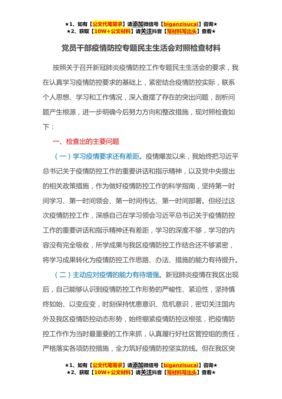 ★1、如有【公文代笔需求】请添加微信号【biganzisucai】咨询★★2、获取【10W+公文材料】请关注抖音【写材料写出头】查看★党员干部疫情防控专题民主生活会对照检查材料按照关于召开新冠肺炎疫情防控工作专题民主生活会的要求,我在认真学习疫情防控要求的基础上,紧密结合疫情防控实际,联系个人思想、学习和工作情况,深入查摆了存在的突出问题,剖析问题产生根源,进一步明确今后努力方向和整改措施,现对照检查如下:一、检查出的主要问题(一)学习疫情要求还有差距。疫情爆发以来,我始终把习近平总书记关于疫情防控工作的重要讲话和指示精神,以及党中央提出的相关政策措施,作为做好疫情防控工作的科学指南,坚持第一时间学习、第一时间领会、第一时间传达、第一时间部署。但经过这次疫情防控工作,深感...