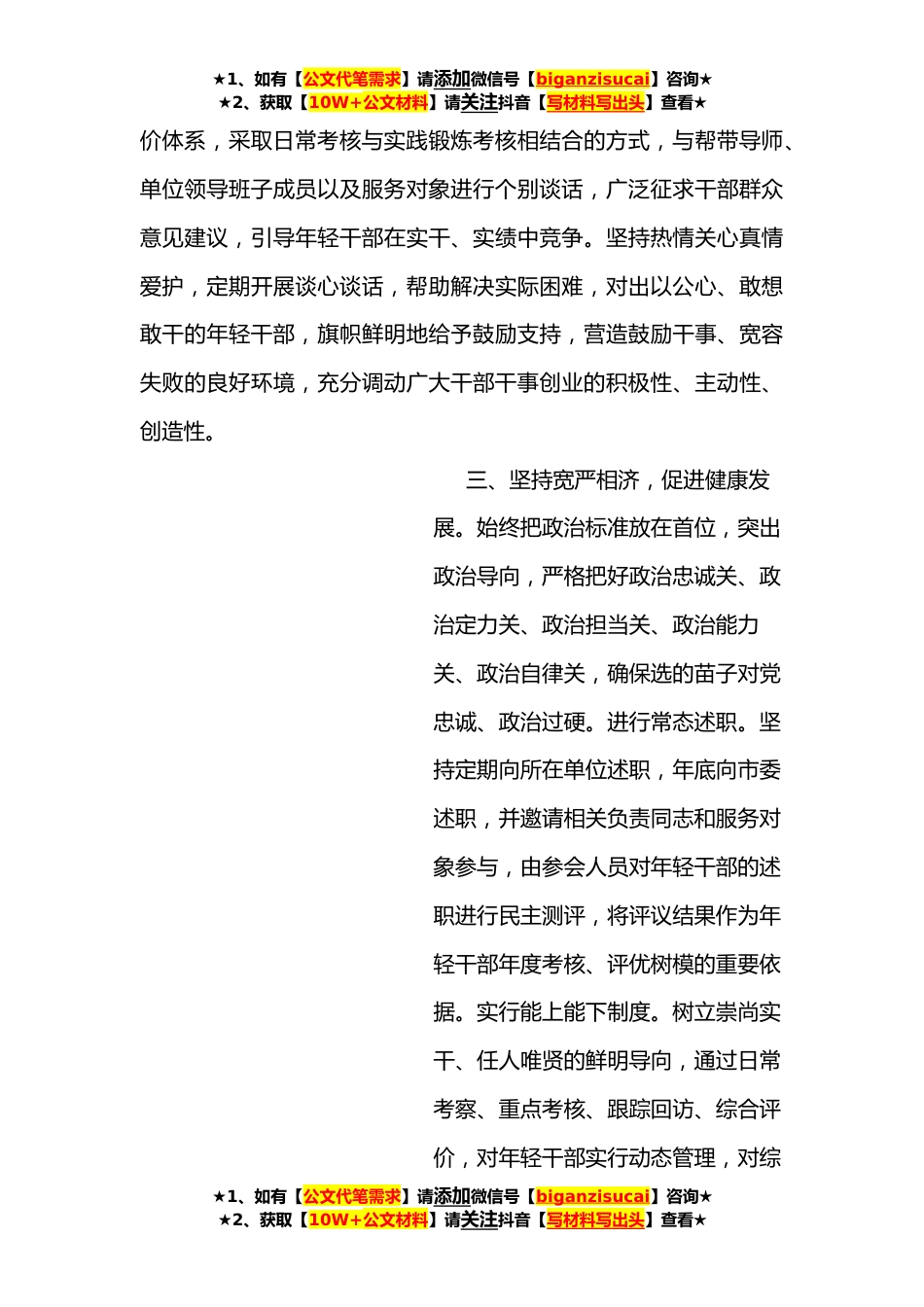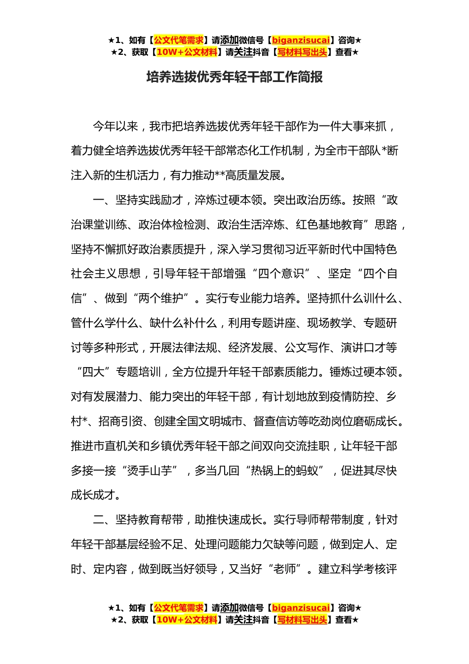 ★1、如有【公文代笔需求】请添加微信号【biganzisucai】咨询★★2、获取【10W+公文材料】请关注抖音【写材料写出头】查看★培养选拔优秀年轻干部工作简报今年以来,我市把培养选拔优秀年轻干部作为一件大事来抓,着力健全培养选拔优秀年轻干部常态化工作机制,为全市干部队*断注入新的生机活力,有力推动**高质量发展。一、坚持实践励才,淬炼过硬本领。突出政治历练。按照“政治课堂训练、政治体检检测、政治生活淬炼、红色基地教育”思路,坚持不懈抓好政治素质提升,深入学习贯彻习近平新时代中国特色社会主义思想,引导年轻干部增强“四个意识”、坚定“四个自信”、做到“两个维护”。实行专业能力培养。坚持抓什么训什么、管什么学什么、缺什么补什么,利用专题讲座、现场教学、专题研讨等多种形式,开展法...