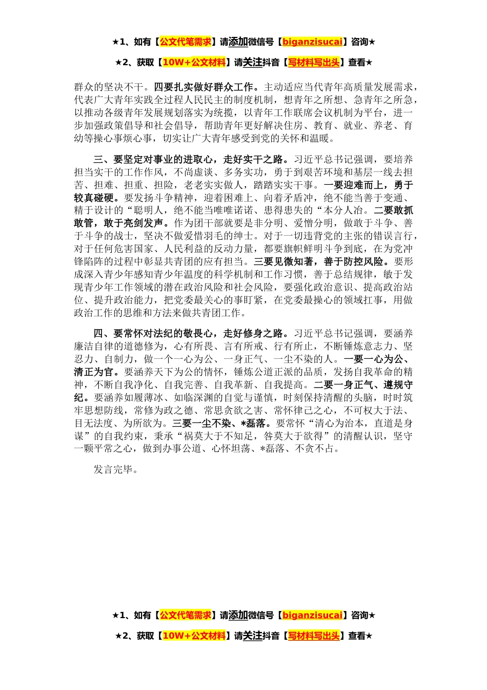 ★1、如有【公文代笔需求】请添加微信号【biganzisucai】咨询★★2、获取【10W+公文材料】请关注抖音【写材料写出头】查看★**日,在庆祝中国共产主义青年团成立**年大会上,习近平总书记发表重要讲话,全面回顾了共青团坚定不移跟党走、为党和人民事业奋斗的光辉历程,深刻阐明了共青团百年征程形成的宝贵经验,指明了新时代共青团工作的努力方向,对广大共青团员寄予殷切希望,对共青团干部提出明确要求。作为一名年轻干部尤其是团干部,要牢记习近平总书记的殷切希望,立志民族*,不负韶华,在青春的赛道上奋力奔跑,为实现中华民族伟大*的中国梦贡献自己的一份力量。一、要守住对党的忠诚心,走好信仰之路。习近平总书记强调,团干部要铸牢对党忠诚的政治品格,高扬理想主义的精神气质,心境澄明,心力茁壮,...