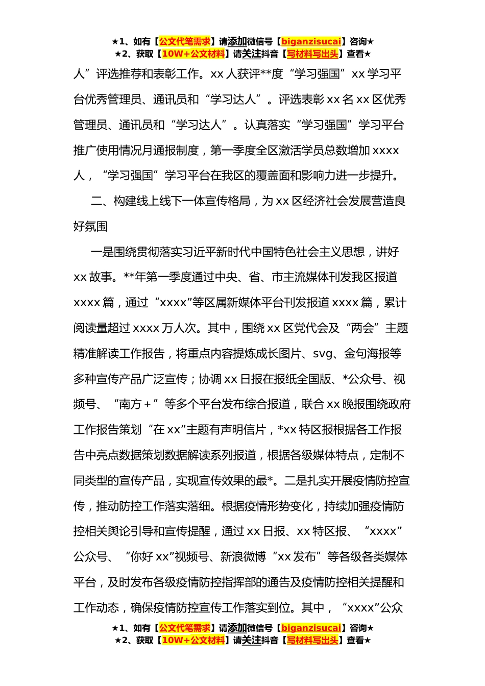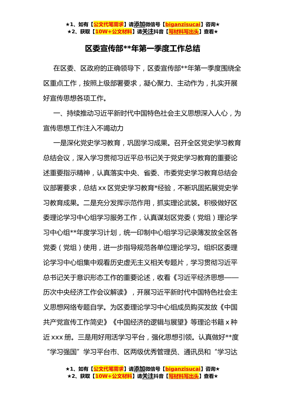 ★1、如有【公文代笔需求】请添加微信号【biganzisucai】咨询★★2、获取【10W+公文材料】请关注抖音【写材料写出头】查看★区委宣传部**年第一季度工作总结在区委、区政府的正确领导下,区委宣传部**年第一季度围绕全区重点工作,按照上级部署要求,凝心聚力、主动作为,扎实开展好宣传思想各项工作。一、持续推动习近平新时代中国特色社会主义思想深入人心,为宣传思想工作注入不竭动力一是深化党史学习教育,巩固学习成果。召开全区党史学习教育总结会议,深入学习贯彻习近平总书记关于党史学习教育的重要论述重要指示精神,认真落实中央、省委、市委党史学习教育总结会议部署要求,总结xx区党史学习教育*经验,不断巩固拓展党史学习教育成果。二是充分发挥示范作用,抓实理论武装。积极做好区委理论学习中心组...