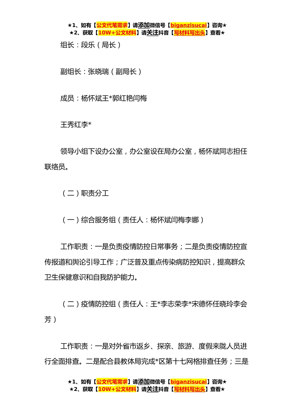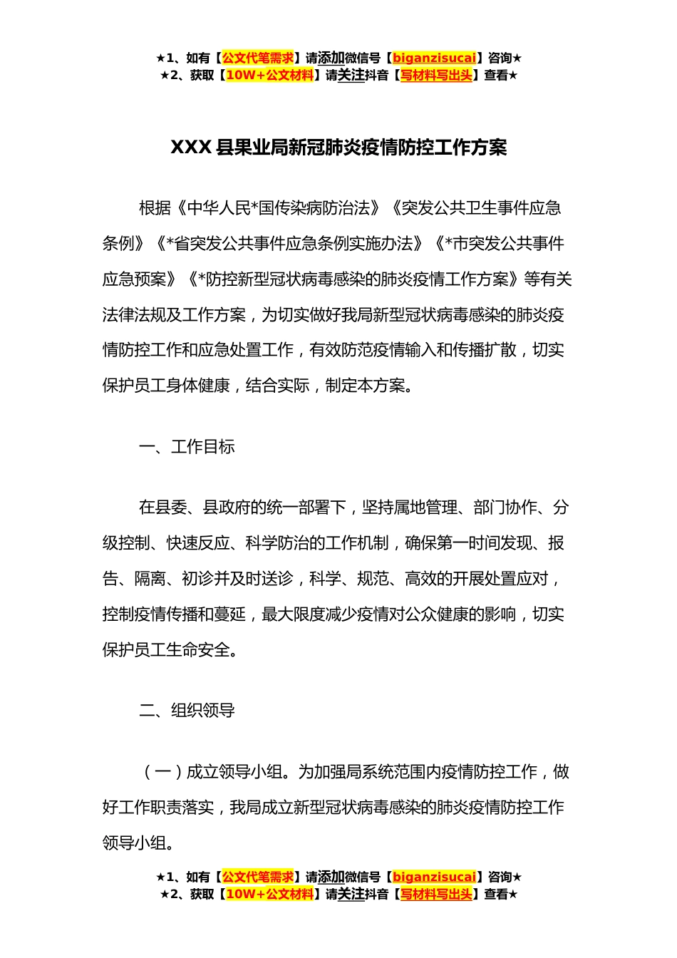 ★1、如有【公文代笔需求】请添加微信号【biganzisucai】咨询★★2、获取【10W+公文材料】请关注抖音【写材料写出头】查看★XXX县果业局新冠肺炎疫情防控工作方案根据《中华人民*国传染病防治法》《突发公共卫生事件应急条例》《*省突发公共事件应急条例实施办法》《*市突发公共事件应急预案》《*防控新型冠状病毒感染的肺炎疫情工作方案》等有关法律法规及工作方案,为切实做好我局新型冠状病毒感染的肺炎疫情防控工作和应急处置工作,有效防范疫情输入和传播扩散,切实保护员工身体健康,结合实际,制定本方案。一、工作目标在县委、县政府的统一部署下,坚持属地管理、部门协作、分级控制、快速反应、科学防治的工作机制,确保第一时间发现、报告、隔离、初诊并及时送诊,科学、规范、高效的开展处置应对,控制...