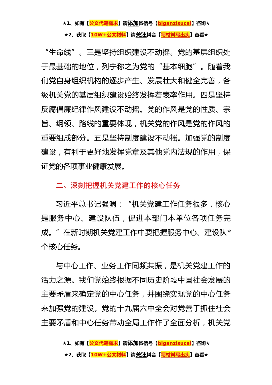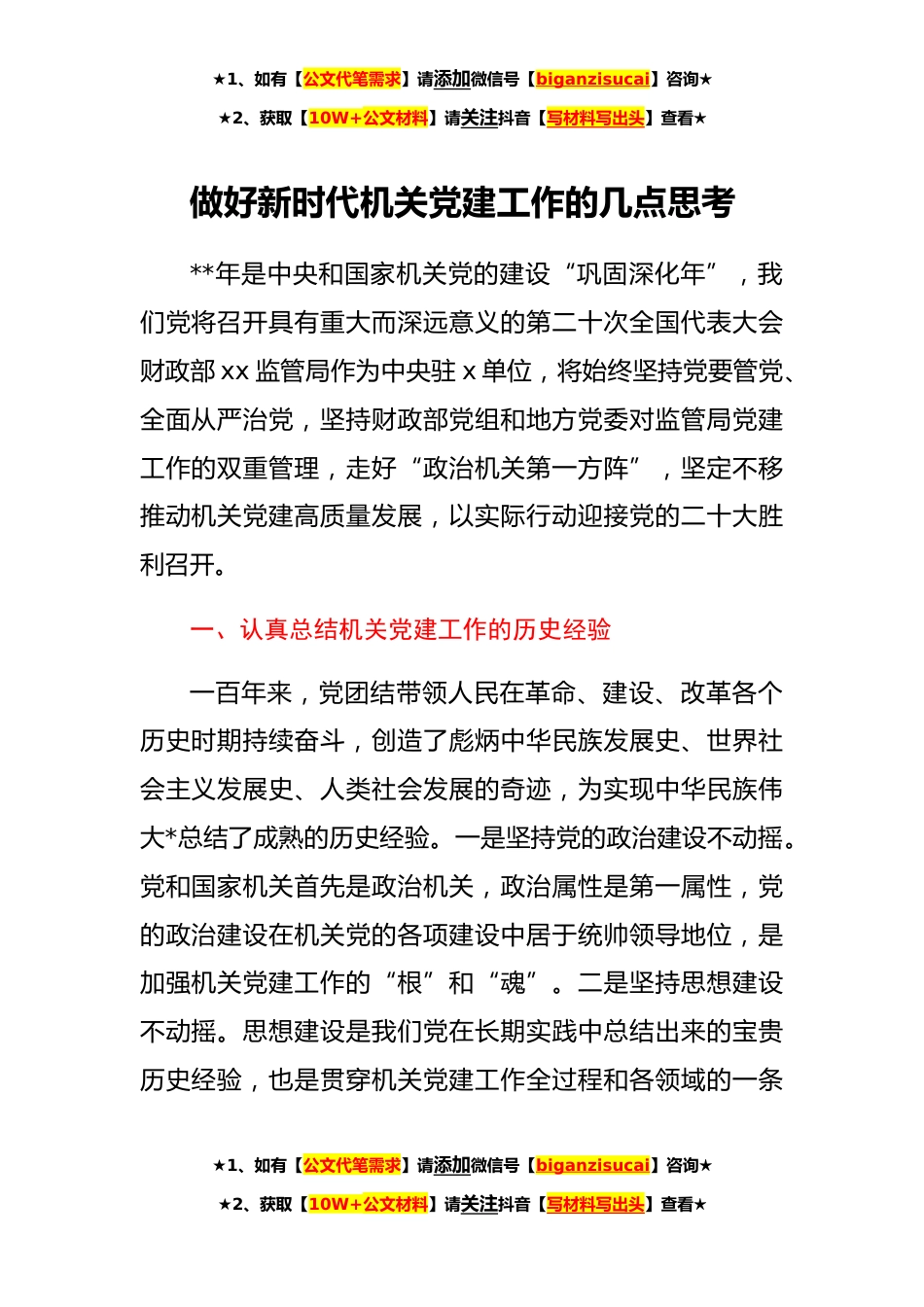 ★1、如有【公文代笔需求】请添加微信号【biganzisucai】咨询★★2、获取【10W+公文材料】请关注抖音【写材料写出头】查看★做好新时代机关党建工作的几点思考**年是中央和国家机关党的建设“巩固深化年”,我们党将召开具有重大而深远意义的第二十次全国代表大会财政部xx监管局作为中央驻x单位,将始终坚持党要管党、全面从严治党,坚持财政部党组和地方党委对监管局党建工作的双重管理,走好“政治机关第一方阵”,坚定不移推动机关党建高质量发展,以实际行动迎接党的二十大胜利召开。一、认真总结机关党建工作的历史经验一百年来,党团结带领人民在革命、建设、改革各个历史时期持续奋斗,创造了彪炳中华民族发展史、世界社会主义发展史、人类社会发展的奇迹,为实现中华民族伟大*总结了成熟的历史经验。一是...