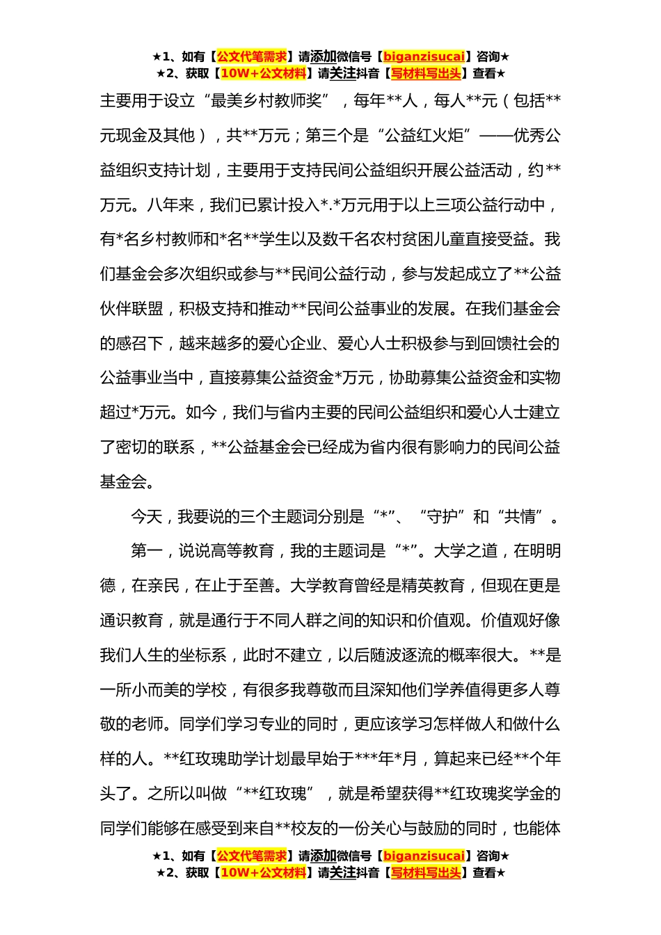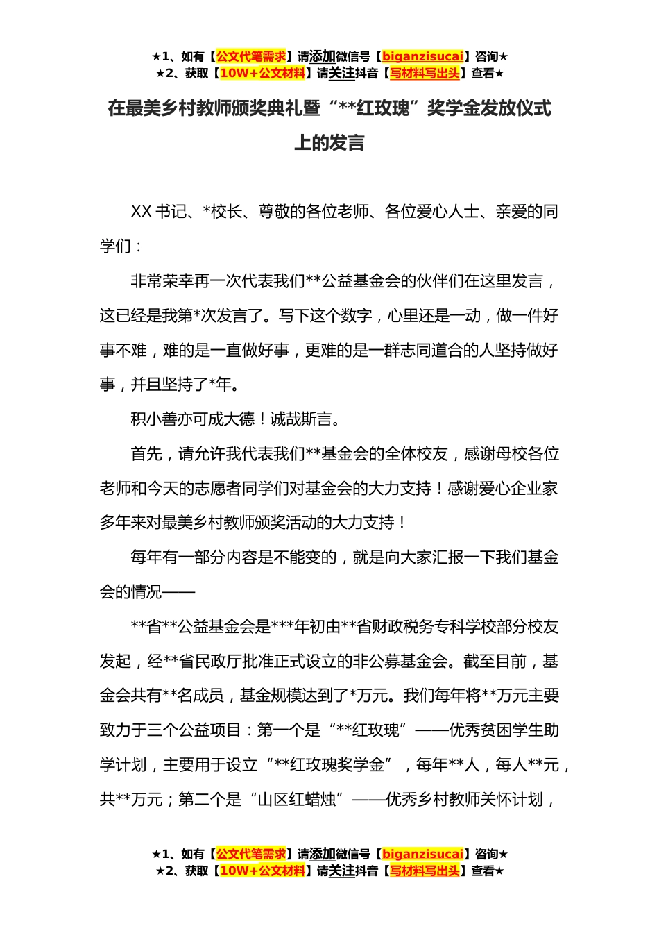 ★1、如有【公文代笔需求】请添加微信号【biganzisucai】咨询★★2、获取【10W+公文材料】请关注抖音【写材料写出头】查看★在最美乡村教师颁奖典礼暨“**红玫瑰”奖学金发放仪式上的发言XX书记、*校长、尊敬的各位老师、各位爱心人士、亲爱的同学们:非常荣幸再一次代表我们**公益基金会的伙伴们在这里发言,这已经是我第*次发言了。写下这个数字,心里还是一动,做一件好事不难,难的是一直做好事,更难的是一群志同道合的人坚持做好事,并且坚持了*年。积小善亦可成大德!诚哉斯言。首先,请允许我代表我们**基金会的全体校友,感谢母校各位老师和今天的志愿者同学们对基金会的大力支持!感谢爱心企业家多年来对最美乡村教师颁奖活动的大力支持!每年有一部分内容是不能变的,就是向大家汇报一下我们基金会的情...