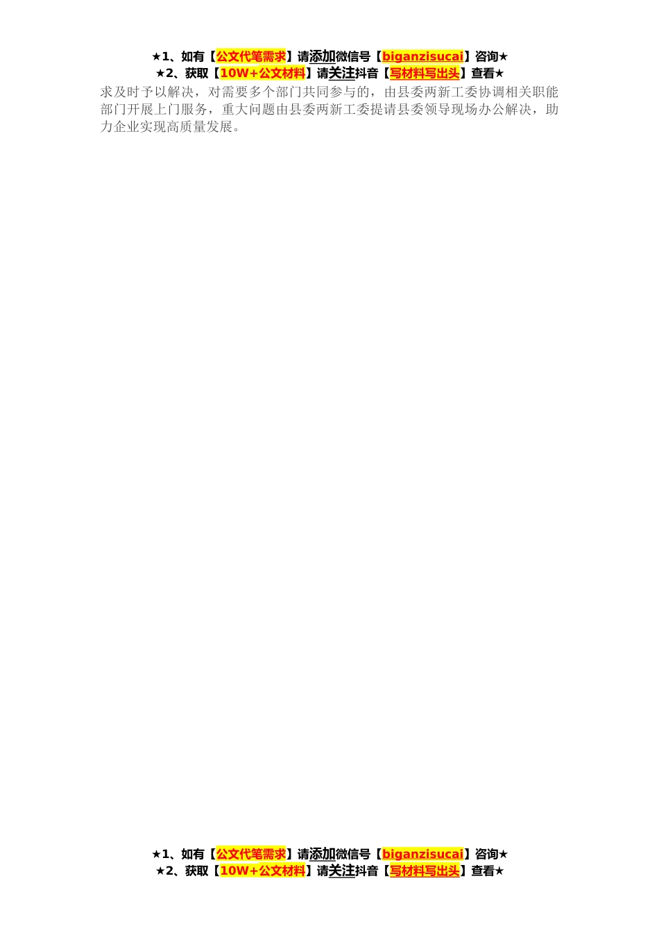 ★1、如有【公文代笔需求】请添加微信号【biganzisucai】咨询★★2、获取【10W+公文材料】请关注抖音【写材料写出头】查看★今年以来,我县在非公经济企业党组织中探索开展“红色引领、绿色发展”主题活动,进一步强化党建引领作用,推动企业安全高效、低碳环保发展。一、“三查行动”提升组织引领力。在全县范围内开展监管部门全面筛查、税务部门重点核查、属地单位实地排查的“三查行动”,全面掌握了解非公企业底数,并分类按照“单独组建、龙头带建、行业统建、联合组建”等方式,及时跟进两新党组织组建各项工作,切实提升党组织引领力。同时,探索推行非公企业党组织“双孵化”模式,坚持“支部建在项目部、党旗插在工地上”,对新引进的项目,在设立指挥部的同时建立临时党组织;引导企业在招录员工时优先...