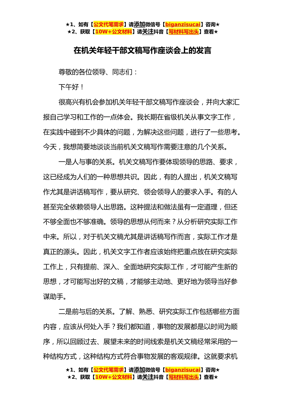 ★1、如有【公文代笔需求】请添加微信号【biganzisucai】咨询★★2、获取【10W+公文材料】请关注抖音【写材料写出头】查看★在机关年轻干部文稿写作座谈会上的发言尊敬的各位领导、同志们:下午好!很高兴有机会参加机关年轻干部文稿写作座谈会,并向大家汇报自己学习和工作的一点体会。我长期在省级机关从事文字工作,在实践中碰到不少具体的问题,为解决这些问题,进行了一些思考。今天,我想简要地谈谈当前机关文稿写作需要注意的几个关系。一是人与事的关系。机关文稿写作要体现领导的思路、要求,这已经成为人们的一种思想共识。因此,有的人提出,机关文稿写作尤其是讲话稿写作,要从研究、领会领导人的要求入手。有的人甚至完全依赖领导人出思路。这种提法和做法虽有一定道理,但还不够全面也不够准确。领...