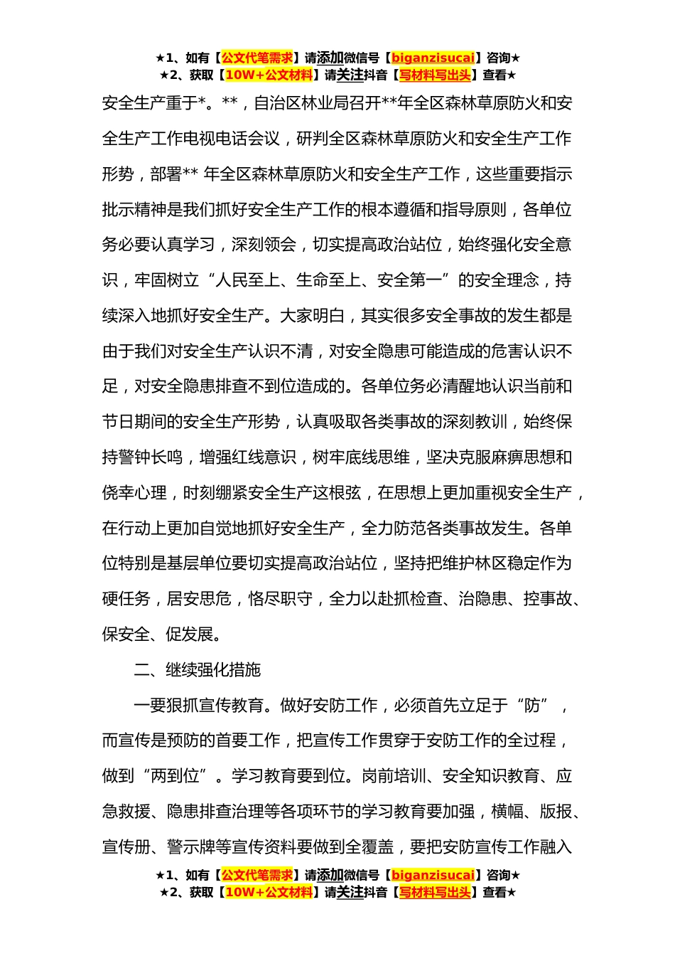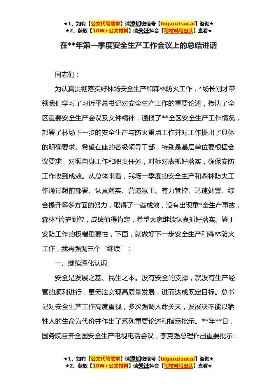 ★1、如有【公文代笔需求】请添加微信号【biganzisucai】咨询★★2、获取【10W+公文材料】请关注抖音【写材料写出头】查看★在**年第一季度安全生产工作会议上的总结讲话同志们:为认真贯彻落实好林场安全生产和森林防火工作,*场长刚才带领我们学习了习近平总书记对安全生产工作的重要论述,传达了全区重要安全生产会议及文件精神,通报了**全区安全生产工作情况,部署了林场下一步的安全生产与防火重点工作并对工作提出了具体的明确要求。希望在座的各级领导干部,特别是基层单位要根据会议要求,对照自身工作和职责任务,对标对表抓好落实,确保安防工作收到成效。从总体来看,我场一季度的安全生产和森林防火工作通过超前部署、认真落实、营造氛围、有力管控、迅速处置、综合提升等多方面的努力,取得了一些成...